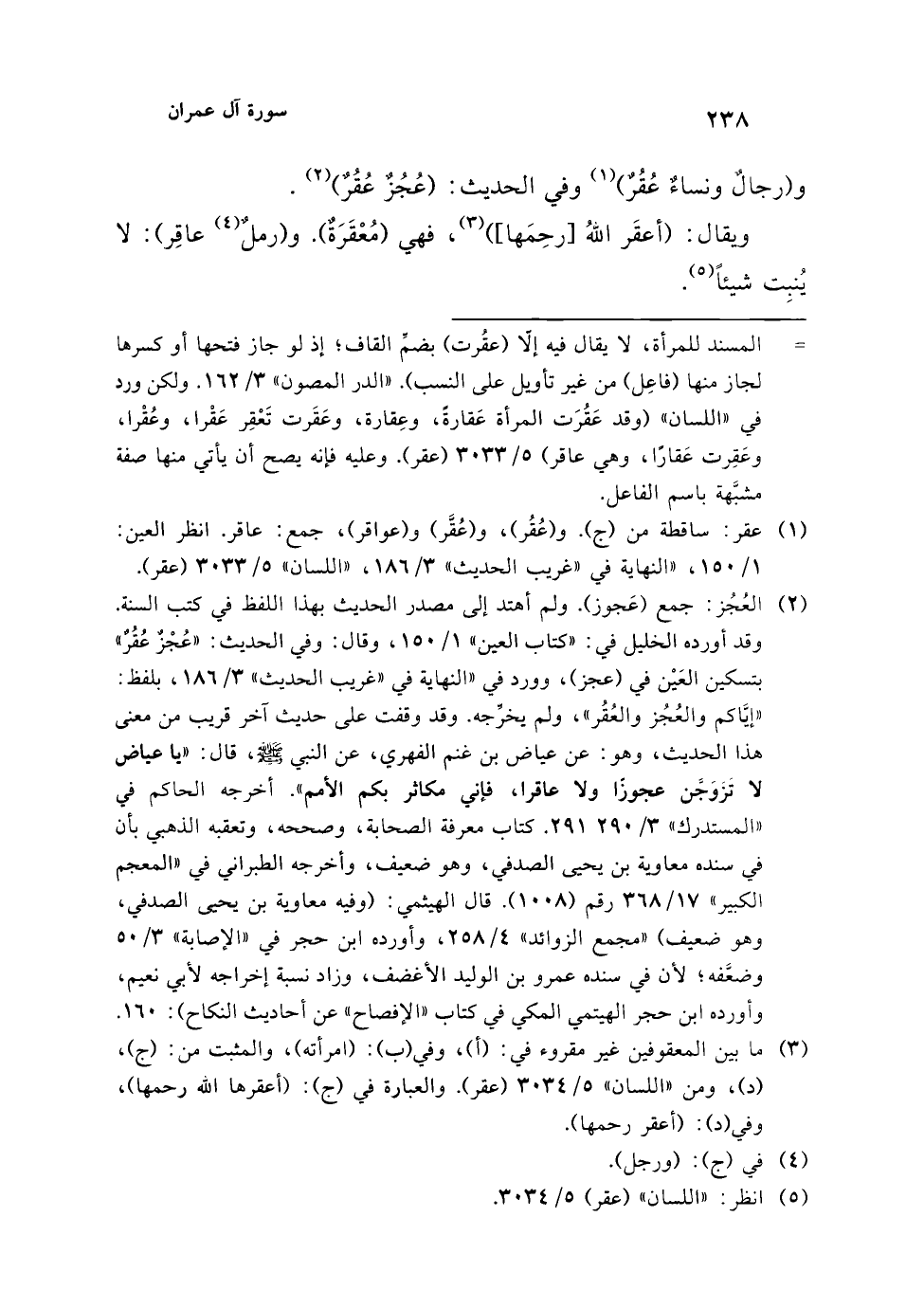 (¬1) عقر: ساقطة من (ج). و (عُقُر)، و (عُقَّر) و (عواقر)، جمع: عاقر. انظر العين: 1/ 150، "النهاية في "غريب الحديث" 3/ 186، "اللسان" 5/ 3033 (عقر).