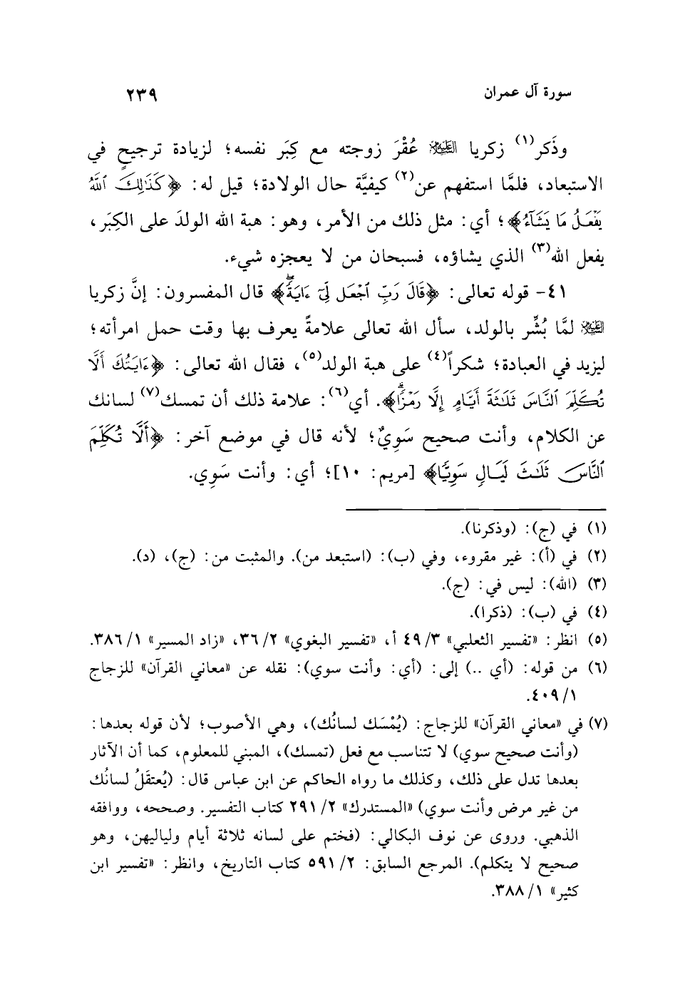 (¬7) في "معاني القرآن" للزجاج: (يُمْسَك لسانُك)، وهي الأصوب؛ لأن قوله بعدها: (وأنت صحيح سوي) لا تتناسب مع فعل (تمسك)، المبني للمعلوم، كما أن الآثار بعدها تدل على ذلك، وكذلك ما رواه الحاكم عن ابن عباس قال: (يُعتقَلُ لسانُك من غير مرض وأنت سوي) "المستدرك" 2/ 291 كتاب التفسير. وصححه، ووافقه الذهبي. وروى عن نوف البكالي: (فختم على لسانه ثلاثة أيام ولياليهن، وهو صحيح لا يتكلم). المرجع السابق: 2/ 591 كتاب التاريخ، وانظر: "تفسير ابن كثير" 1/ 388.