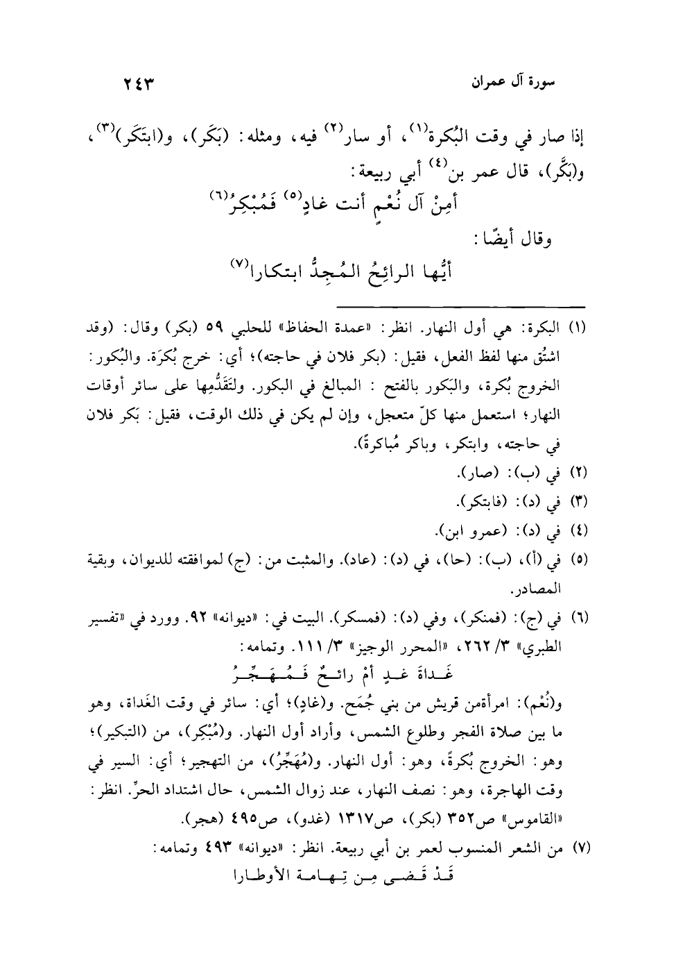 (¬1) البكرة: هي أول النهار. انظر: "عمدة الحفاظ" للحلبي 59 (بكر) وقال: (وقد اشتُق منها لفظ الفعل، فقيل: (بكر فلان في حاجته)؛ أي: خرج بُكرَة والبُكور: الخروج بُكرة، والبَكور بالفتح: المبالغ في البكور. ولتَقَدُّمِها على سائر أوقات النهار؛ استعمل منها كلّ متعجل، وإن لم يكن في ذلك الوقت، فقيل: بَكر فلان في حاجته، وابتكر، وباكر مُباكرةً).