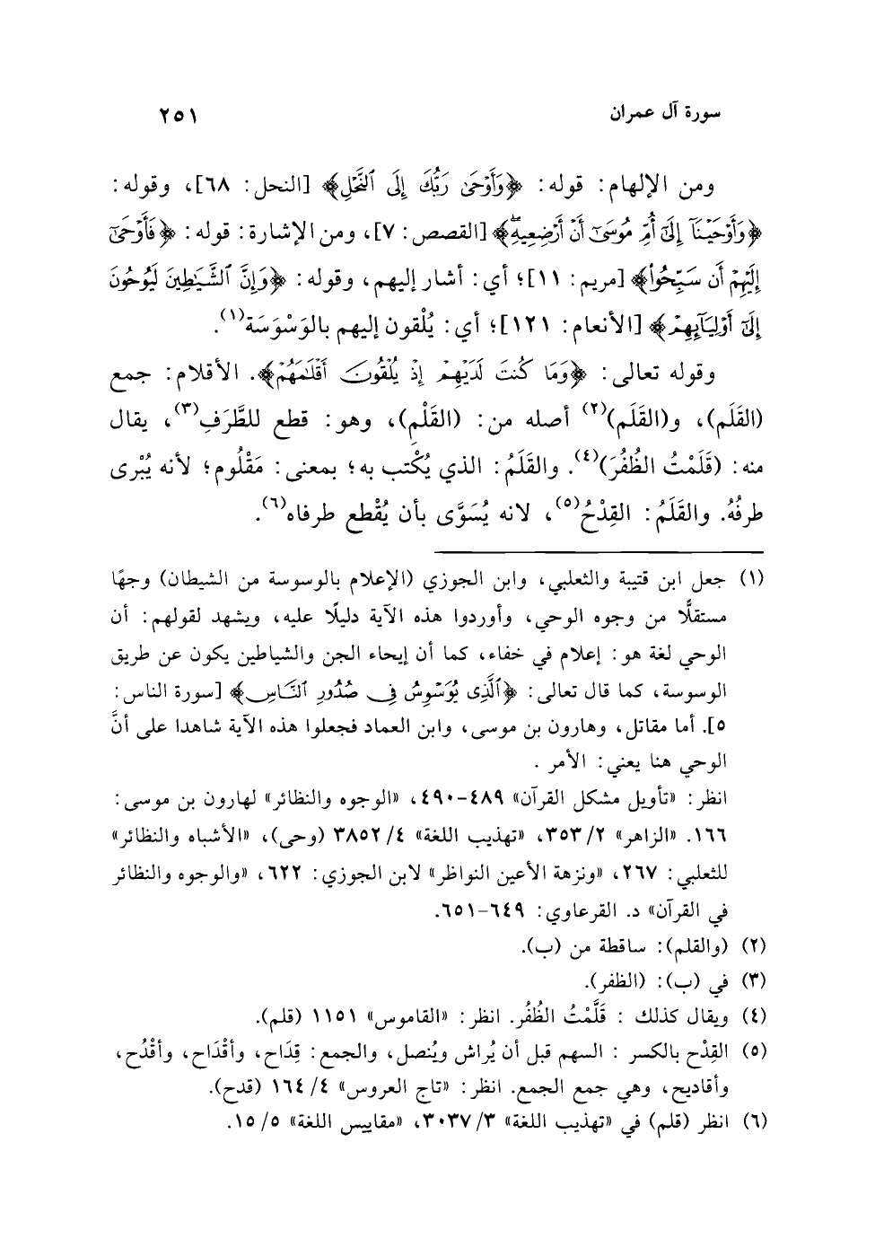 وقوله تعالى: {وَمَا كُنْتَ لَدَيْهِمْ إِذْ يُلْقُونَ أَقْلَامَهُمْ}. الأقلام: جمع (القَلَم)، و (القَلَم) (¬2) أصله من: (القَلْمِ)، وهو: قطع للطَّرَفِ (¬3)، يقال منه: (قَلَمْتُ الظُفُرَ) (¬4). والقَلَمُ: الذي يُكْتب به؛ بمعنى: مَقْلُوم؛ لأنه يُبْرى طرفُهُ. والقَلَمُ: القِدْحُ (¬5)، لانه يُسَوَّى بأن يُقْطع طرفاه (¬6).