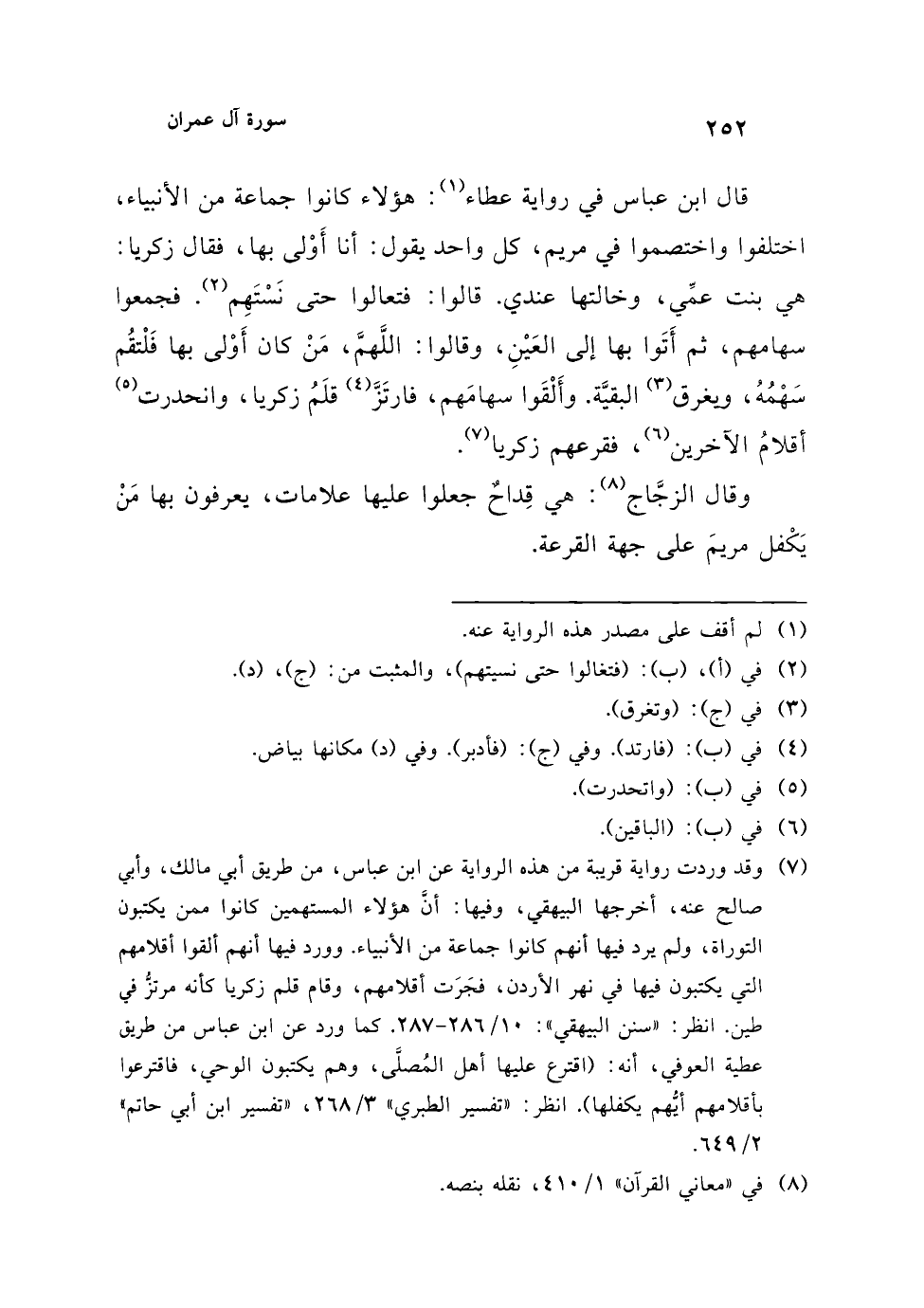 (¬7) وقد وردت رواية قريبة من هذه الرواية عن ابن عباس، من طريق أبي مالك، وأبي صالح عنه، أخرجها البيهقي، وفيها: أنَّ هؤلاء المستهمين كانوا ممن يكتبون التوراة، ولم يرد فيها أنهم كانوا جماعة من الأنبياء. وورد فيها أنهم ألقوا أقلامهم التي يكتبون فيها في نهر الأردن، فجَرَت أقلامهم، وقام قلم زكريا كأنه مرتزُّ في طين. انظر: "سنن البيهقي": 10/ 286 - 287. كما ورد عن ابن عباس من طريق عطية العوفي، أنه: (اقترع عليها أهل المُصلَّى، وهم يكتبون الوحي، فاقترعوا بأقلامهم أيُّهم يكفلها). انظر: "تفسير الطبري" 3/ 268، "تفسير ابن أبي حاتم" 2/ 649.