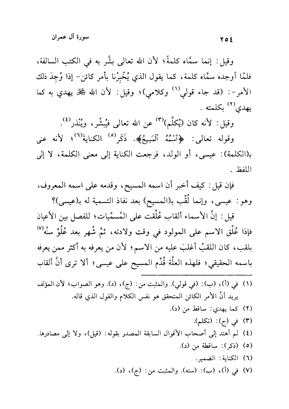 وقيل: إنما سمَّاه كلمةً؛ لأن الله تعالى بشَّر به في الكتب السالفة، فلمَّا أوجده سمَّاه كلمة، كما يقول الذي يُخْبِرُنا بأمر كائن -إذا وُجِدَ ذلك الأمر-: (قد جاء قولي (¬1) وكلامي)، وقيل: لأن الله عز وجل يهدي به كما يهدي (¬2) بكلمته.