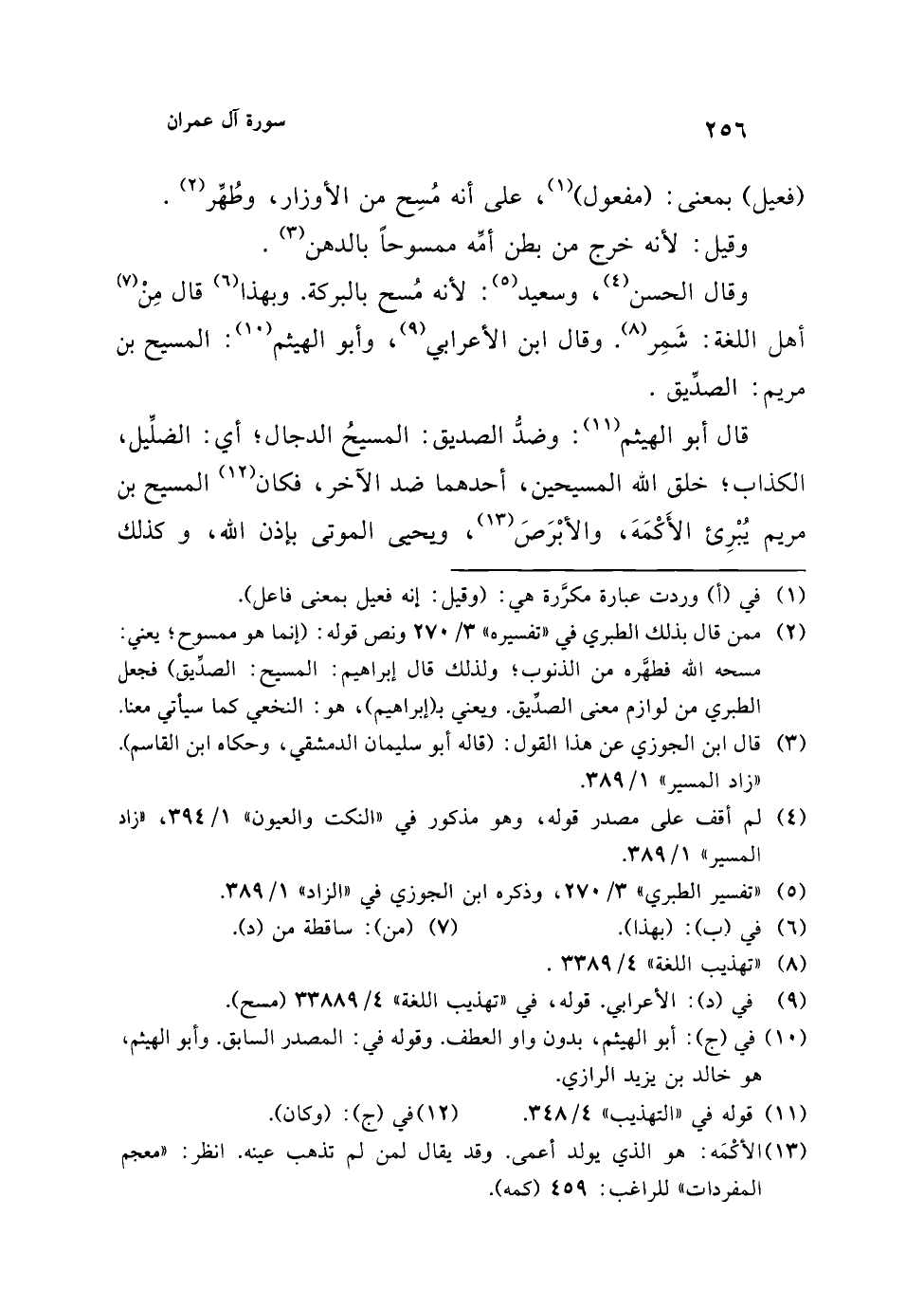 (¬2) ممن قال بذلك الطبري في "تفسيره" 3/ 270 ونص قوله: (إنما هو ممسوح؛ يعني: مسحه الله فطهَّره من الذنوب؛ ولذلك قال إبراهيم: المسيح: الصدِّيق) فجعل الطبري من لوازم معنى الصدِّيق. ويعني بـ (إبراهيم)، هو: النخعي كما سيأتي معنا.