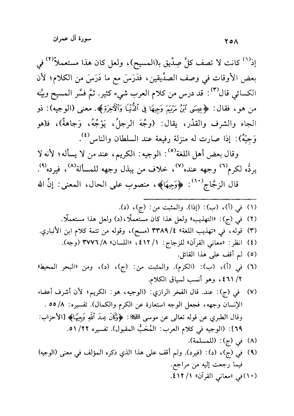 (¬7) في (ج): عند. قال الفخر الرازي: (الوجيه، هو: الكريم؛ لأن أشرف أعضاء الإنسان وجهه، فجعل الوجه استعارة عن الكرم والكمال). تفسيره: 8/ 55. وقال الطبري عن قوله تعالى عن موسى عليه السلام: {وَكَانَ عِنْدَ اللَّهِ وَجِيهًا} [الأحزاب: 69]: (الوجيه في كلام العرب: المُحَبُّ المقبول). تفسيره 22/ 51.