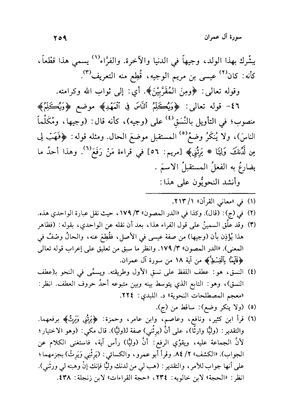 (¬3) وقد علَّق السمينُ على قول الفراء هذا، بعد أن نقله عن الواحدي، بقوله: (فظاهر هذا يُوذِن بأن (وجيها) من صفة عيسى في الأصل، فقُطِعَ عنه، والحالُ وصْفٌ في المعنى). "الدر المصون" 3/ 179. وانظر ما سبق من تعليق على إعراب قوله تعالى {قَائِمًا بِالْقِسْطِ} من آية 18 من سورة آل عمران.