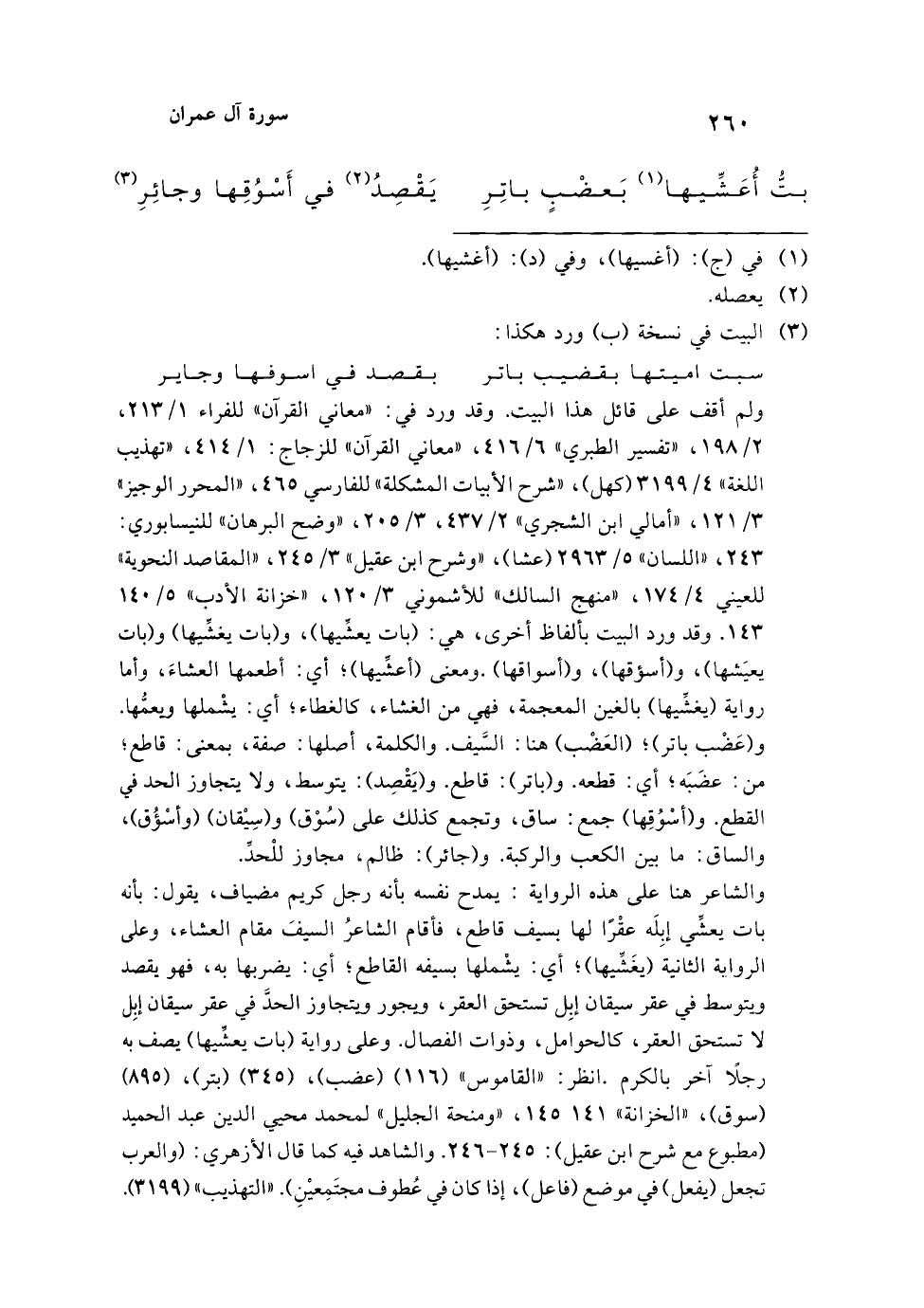 والشاعر هنا على هذه الرواية: يمدح نفسه بأنه رجل كريم مضياف، يقول: بأنه بات يعشِّي إبِلَه عقْرًا لها بسيف قاطع، فأقام الشاعرُ السيفَ مقام العشاء، وعلى الرواية الثانية (يغَشِّيها)؛ أي: يشْملها بسيفه القاطع؛ أي: يضربها به، فهو يقصد ويتوسط في عقر سيقان إبِل تستحق العقر، ويجور ويتجاوز الحدَّ في عقر سيقان إبِل لا تستحق العقر، كالحوامل، وذوات الفصال. وعلى رواية (بات يعشِّيها) يصف به رجلًا آخر بالكرم. انظر: "القاموس" (116) (عضب)، (345) (بتر)، (895) (سوق)، "الخزانة" 145141، "ومنحة الجليل" لمحمد محيي الدين عبد الحميد (مطبوع مع شرح ابن عقيل): 245 - 246. والشاهد فيه كما قال الأزهري: (والعرب تجعل (يفعل) في موضع (فاعل)، إذا كان في عُطوف مجتَمِعيْنِ). "التهذيب" (3199).