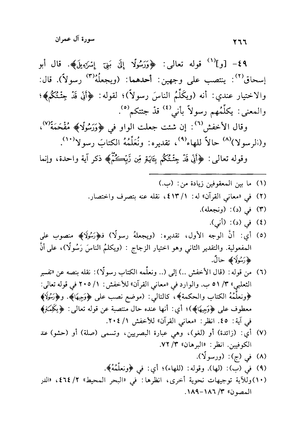 (¬6) من قوله: (قال الأخفش ..) إلى (.. ونعلِّمه الكتاب رسولًا): نقله بنصه عن "تفسير الثعلبي" 3/ 51 ب. والوارد في "معاني القرآن" للأخفش: 1/ 205 في قوله تعالى: {ونعلَّمُهُ الْكِتَابَ وَالْحِكْمَةَ}، كالتالي: (موضع نصب على {وَجِيهًا}. و {رَسُولاً} معطوف على {وَجِيهًا}؛ أي: أنها عنده حال منتصبة عن قوله تعالى: {بِكَلِمَةٍ} في آية: 45. انظر: "معاني القرآن" للأخفش 1/ 204.