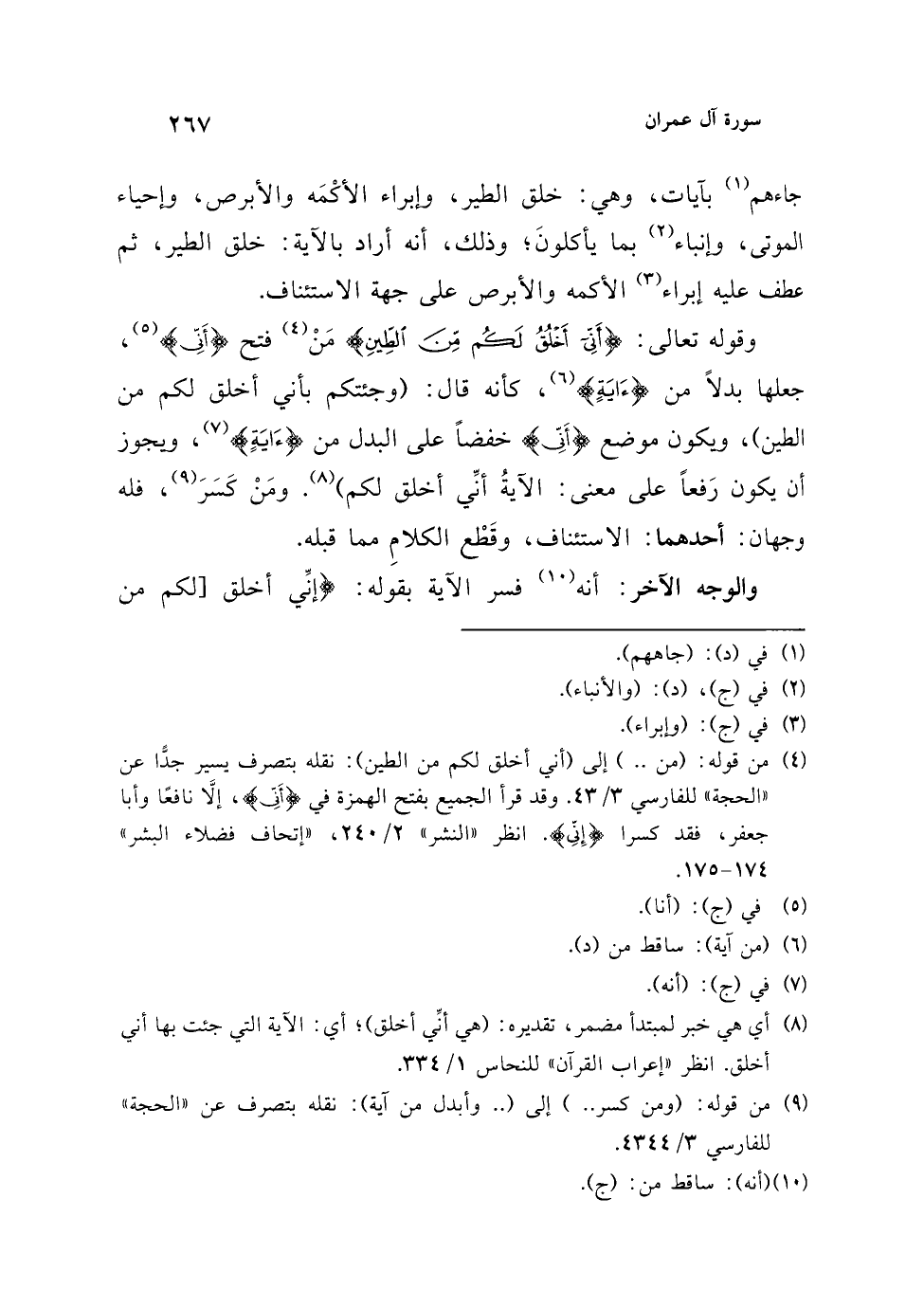 (¬4) من قوله: (من ..) إلى (أني أخلق لكم من الطين): نقله بتصرف يسير جدًّا عن "الحجة" للفارسي 3/ 43. وقد قرأ الجميع بفتح الهمزة في {أَنِّي}، إلَّا نافعًا وأبا جعفر، فقد كسرا {أَنِّي}. انظر "النشر" 2/ 240، "إتحاف فضلاء البشر" 174 - 175.