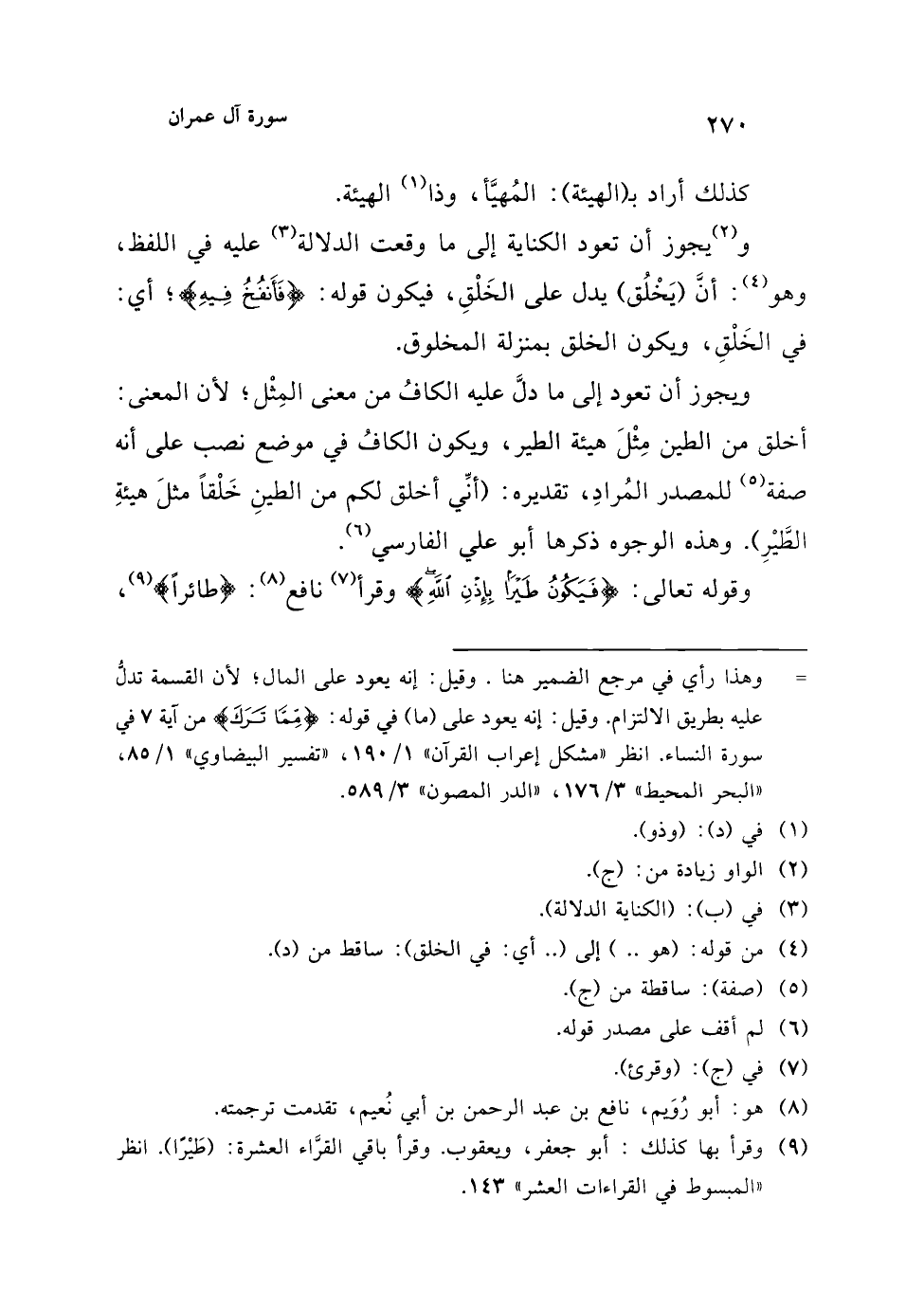 ويجوز أن تعود إلى ما دلَّ عليه الكافُ من معنى المِثْل؛ لأن المعنى: أخلق من الطين مِثْلَ هيئة الطير، ويكون الكافُ في موضع نصب على أنه صفة (¬5) للمصدر المُرادِ، تقديره: (أنِّي أخلق لكم من الطينِ خَلْقاً مثلَ هيئةِ الطَّيْرِ). وهذه الوجوه ذكرها أبو علي الفارسي (¬6).