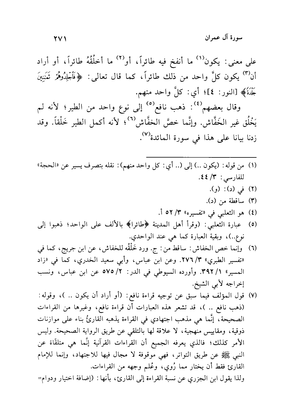 (¬7) قول المؤلف فيما سبق عن توجيه قراءة نافع: (أو أراد أن يكون ..)، وقوله: (ذهب نافع ..)، قد تشعر هذه العبارات أن قراءة نافع، وغيرها من القراءات الصحيحة، إنَّما هي مذهب اجتهادي في القراءة يذهبه القارئُ بناء على موازنات ذوقية، ومقاييس منهجية، لا علاقة لها بالتلقي عن طريق الرواية الصحيحة. وليس الأمر كذلك؛ فالذي يعرفه الجميع أن القراءات القرآنية إنَّما هي متلقّاة عن النبي - صلى الله عليه وسلم - عن طريق التواتر، فهي موقوفة لا مجال فيها للاجتهاد، وإنما للإمام القارئ فقط أن يختار مما رُوي، وعُلم وجهه من القراءات.
