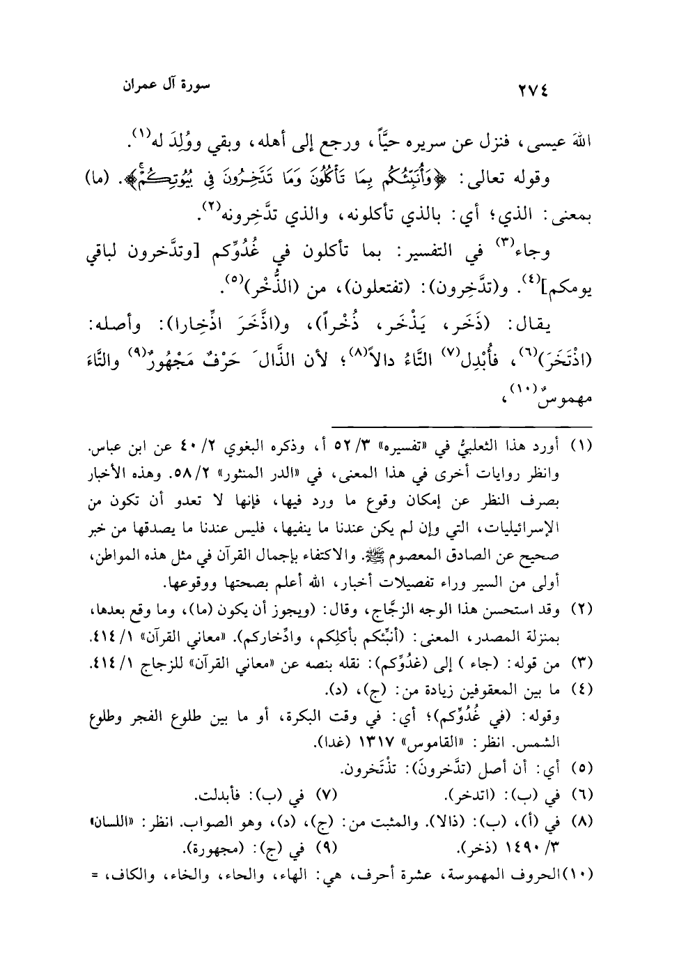 وقوله تعالى: {وَأُنَبِّئُكُمْ بِمَا تَأْكُلُونَ وَمَا تَدَّخِرُونَ فِي بُيُوتِكُمْ}. (ما) بمعنى: الذي؛ أي: بالذي تأكلونه، والذي تدَّخِرونه (¬2).