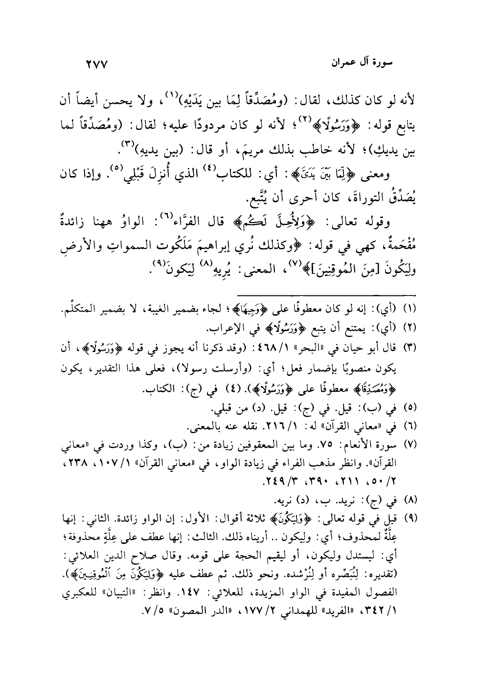 (¬9) قيل في قوله تعالى: {وَلِيَكُونَ} ثلاثة أقوال: الأول: إن الواو زائدة. الثاني: إنها عِلَّةٌ لمحذوف؛ أي: ولِيكون .. أريناه ذلك. الثالث: إنها عطف على عِلَّةٍ محذوفة؛ أي: ليستدل وليكون، أو ليقيم الحجة على قومه. وقال صلاح الدين العلائي: (تقديره: لِنبصِّره أو لِنُرْشده. ونحو ذلك. ثم عطف عليه {وَلِيَكُونَ مِنَ الْمُوقِنِينَ}. الفصول المفيدة في الواو المزيدة، للعلائي: 147. وانظر: "التبيان" للعكبري 1/ 342، "الفريد" للهمداني 2/ 177، "الدر المصون" 5/ 7.