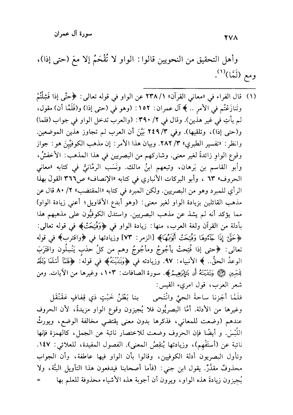 (¬1) قال الفراء في "معاني القرآن" 1/ 238 عن الواو في قوله تعالى: {حَتَّى إِذَا فَشِلْتُمْ وَتَنَازَعْتُمْ فِي الْأَمْرِ ...} آل عمران: 152: (وهو في (حتى إذا) و (فَلَمَّا أن) مقول، لم يأتِ في غير هذين). وقال في 2/ 390: (والعرب تدخل الواو في جواب (فلما) و (حتى إذا)، وتلقيها). وفي 3/ 249 بَيَّنَ أن العرب لم تجاوز هذين الموضعين. وانظر: "تفسير الطبري" 3/ 282. وبيان هذا الأمر: إن مذهب الكوفيِّيِنَ هو: جواز وقوع الواوِ زائدةً لغير معنى. وشاركهم من البصريين في هذا المذهب: الأخفشُ، وأبو القاسم بن بَرهان، وتبعهم ابنُ مالك. ونَسَب الرمَّانيُّ في كتابه "معاني الحروف" 63، وأبو البركات الأنباري في كتابه "الإنصاف" ص 366 القولَ بهذا الرأي للمبرد وهو من البصريين. ولكن المبرد في كتابه "المقتضب" 2/ 80 قال عن مذهب القائلين بزيادة الواو لغير معنى: (وهو أبدع الأقاويل؛ أعني زيادة الواو) مما يؤكد أنه لم يشذ عن مذهب البصريين. واستدل الكوفيُّون على مذهبهم هذا بأدلة من القرآن ولغة العرب، منها: زيادة الواو في {وَفُتِحَتْ} في قوله تعالى: {حَتَّى إِذَا جَاءُوهَا وَفُتِحَتْ أَبْوَابُهَا} [الزمر: 73] وزيادتها في {وَاقْتَرَبَ} في قوله تعالى: {حَتَّى إِذَا فُتِحَتْ يَأْجُوجُ وَمَأْجُوجُ وَهُمْ مِنْ كُلِّ حَدَبٍ يَنْسِلُونَ وَاقْتَرَبَ الْوَعْدُ الْحَقُّ} الأنبياء: 97. وزيادته في {وَنَادَيْنَاهُ} في قوله: {فَلَمَّا أَسْلَمَا وَتَلَّهُ لِلْجَبِينِ (103) وَنَادَيْنَاهُ أَنْ يَا إِبْرَاهِيمُ} سورة الصافات: 103، وغيرها من الآيات. ومن شعر العرب، قول امريء القيس: