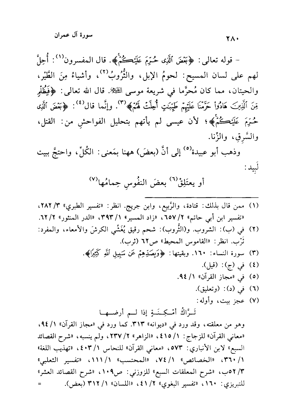 - قوله تعالى: {بَعْضَ الَّذِي حُرِّمَ عَلَيْكُمْ}. قال المفسرون (¬1): أُحِلَّ لهم على لسان المسيح: لحومُ الإبل، والثُّرُوبُ (¬2)، وأشياءُ مِنَ الطَّيْر، والحيتان، مما كان مُحرَّما في شريعة موسى عليه السلام. قال الله تعالى: {فَبِظُلْمٍ مِنَ الَّذِينَ هَادُوا حَرَّمْنَا عَلَيْهِمْ طَيِّبَاتٍ أُحِلَّتْ لَهُمْ} (¬3). وإنَّما قال (¬4): {بَعْضَ الَّذِي حُرِّمَ عَلَيْكُمْ}؛ لأن عيسى لم يأتهم بتحليل الفواحش من: القتل، والسَّرِقِ، والزِّنا.