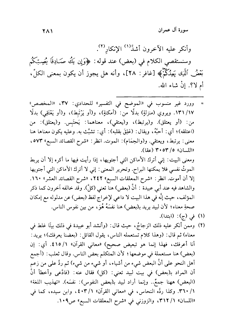 ومعنى البيت: إني أترك الأماكن التي أجتويها، إذا رأيت فيها ما أكره إلا أن يربط الموتُ نفسي فلا يمكنها البراح. وتحرير المعنى: إني لا أترك الأماكن التي أجتويها إلا أن أموت. انظر: "شرح المعلقات السبع" 242، "شرح القصائد العشر" 160. والشاهد فيه عند أبي عبيدة: أنَّ (بعض) هنا تعني (كلَّ). وقد خالفه آخرون كما ذكر المؤلف، حيث إنَّه في هذا البيت لا داعي لإخراج لفظ (بعض) عن مدلوله مع إمكان صحةِ معناه؛ لأن لبيد يريد بـ (بعض) هنا نفسَهُ هُوَ، من بين نفوس الناس.