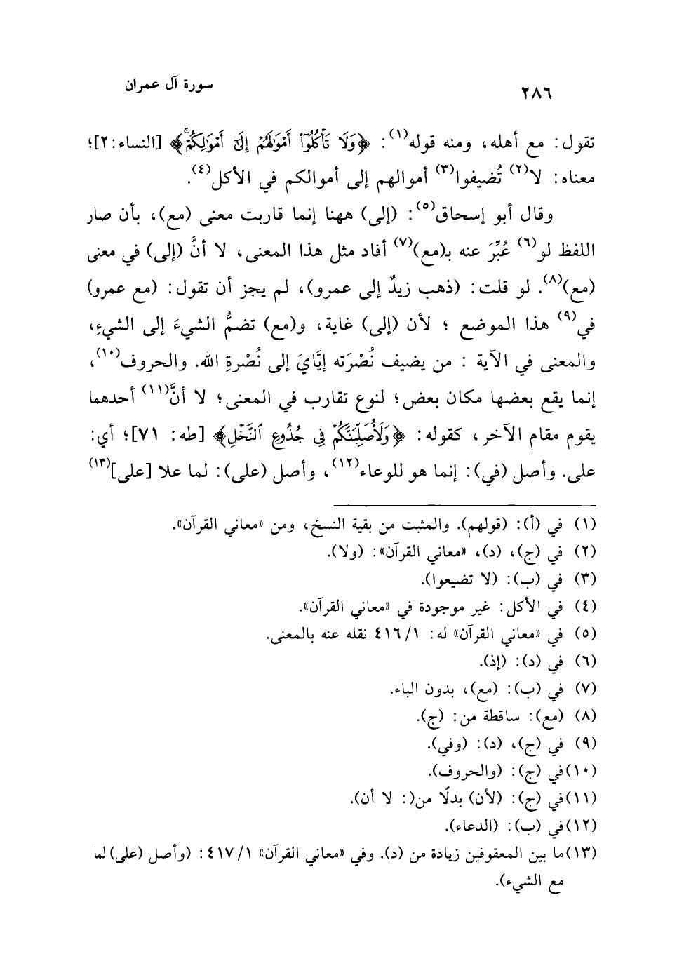 وقال أبو إسحاق (¬5): (إلى) ههنا إنما قاربت معنى (مع)، بأن صار اللفظ لو (¬6) عُبِّرَ عنه بـ (مع) (¬7) أفاد مثل هذا المعنى، لا أنَّ (إلى) في معنى (مع) (¬8). لو قلت: (ذهب زيد إلى عمرو)، لم يجز أن تقول: (مع عمرو) في (¬9) هذا الموضع؛ لأن (إلى) غاية، و (مع) تضمُّ الشيءَ إلى الشيءِ، والمعنى في الآية: من يضيف نُصْرَته إيَّايَ إلى نُصْرةِ الله. والحروف (¬10)، إنما يقع بعضها مكان بعض؛ لنوع تقارب في المعنى؛ لا أنَّ (¬11) أحدهما يقوم مقام الآخر، كقوله: {وَلَأُصَلِّبَنَّكُمْ فِي جُذُوعِ النَّخْلِ} [طه: 71]؛ أي: على. وأصل (في): إنما هو للوعاء (¬12)، وأصل (على): لما علا [على] (¬13)