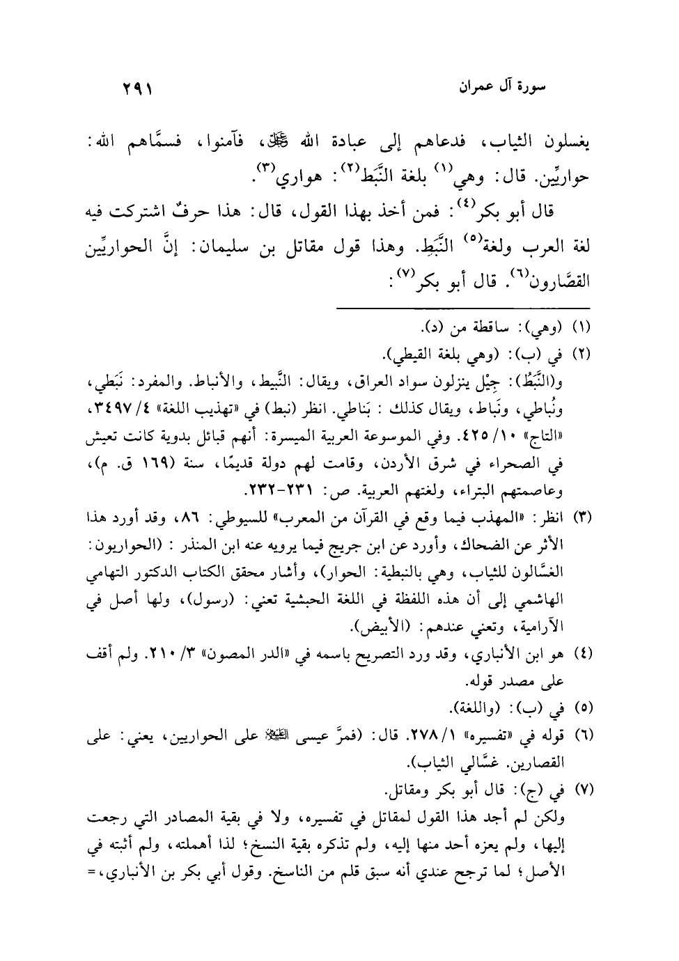 (¬3) انظر: "المهذب فيما وقع في القرآن من المعرب" للسيوطي: 86، وقد أورد هذا الأثر عن الضحاك، وأورد عن ابن جريج فيما يرويه عنه ابن المنذر: (الحواريون: الغسَّالون للثياب، وهي بالنبطية: الحوار)، وأشار محقق الكتاب الدكتور التهامي الهاشمي إلى أن هذه اللفظة في اللغة الحبشية تعني: (رسول)، ولها أصل في الآرامية، وتعني عندهم: (الأبيض).