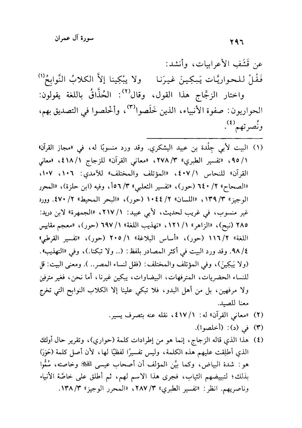(¬1) البيت لأبي جِلْدة بن عبيد اليشكري. وقد ورد منسوبًا له، في "مجاز القرآن" 1/ 95، "تفسير الطبري" 3/ 278، "معاني القرآن" للزجاج 1/ 418،"معاني القرآن" للنحاس 1/ 407، "المؤتلف والمختلف" للآمدي: 106، 107، "الصحاح" 2/ 640 (حور)، "تفسير الثعلبي" 3/ 56 أ، وفيه (ابن حلزة)، "المحرر الوجيز" 3/ 139، "اللسان" 2/ 1044 (حور)، " البحر المحيط" 2/ 470. وورد غير منسوب، في غريب لحديث، لأبي عبيد: 1/ 217، "الجمهرة" لابن دريد: 285 (نبح)، "الزاهر" 1/ 121، "تهذيب اللغة" 1/ 697 (حور)، "معجم مقاييس اللغة" 2/ 116 (حور)، "أساس البلاغة" 1/ 205 (حور)، "تفسير القرطبي" 4/ 98. وقد ورد البيت في أكثر المصادر بلفظ: (.. ولا تبكنا.)، وفي "التهذيب". (ولا يَبكِينَ)، وفي المؤتلف والمختلف: (فقل لنساء المصر ..). ومعنى البيت: قل للنساء الحضريات، المترفهات، البيضاوات، يبكين غيرنا، أما نحن، فغير مترفين ولا مرفهين، بل من أهل البدو، فلا تبكي علينا إلا الكلاب النوابح التي تخرج معنا للصيد.