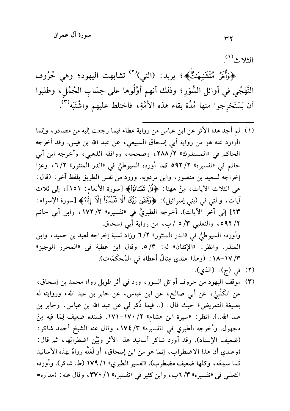 (¬3) موقف اليهود من حروف أوائل السور، ورد في أثر طويل رواه محمد بن إسحاق، عن الكَلْبِيُّ، عن أبي صالح، عن ابن عباس، عن جابر بن عبد الله، وروايته له بصيغة التمريض؛ حيث قال: (.. فيما ذُكر لي عن عبد الله بن عباس، وجابر بن عبد الله ..). انظر: "سيرة ابن هشام" 2/ 170 - 171. فسنده ضعيف لِمَا فيه مِنْ مجهول. وأخرجه الطبري في "تفسيره" 3/ 174، وقال عنه الشيخ أحمد شاكر: (ضعيف الإسناد). وقد أورد شاكر أسانيد هذا الأثر وبَيَّن اضطرابَها، ثم قال: (وعندي أن هذا الاضطراب، إنما هو من ابن إسحاق، أو لَعَلَّه رواهُ بهذه الأسانيد كمَا سَمِعَه، وكلها ضعيف مضطرب). "تفسير الطبري" 1/ 179 (ط. شاكر). وأورده الثعلبي في "تفسيره" 3/ 6 ب، وابن كثير في "تفسيره" 1/ 370، وقال عنه: (مداره=