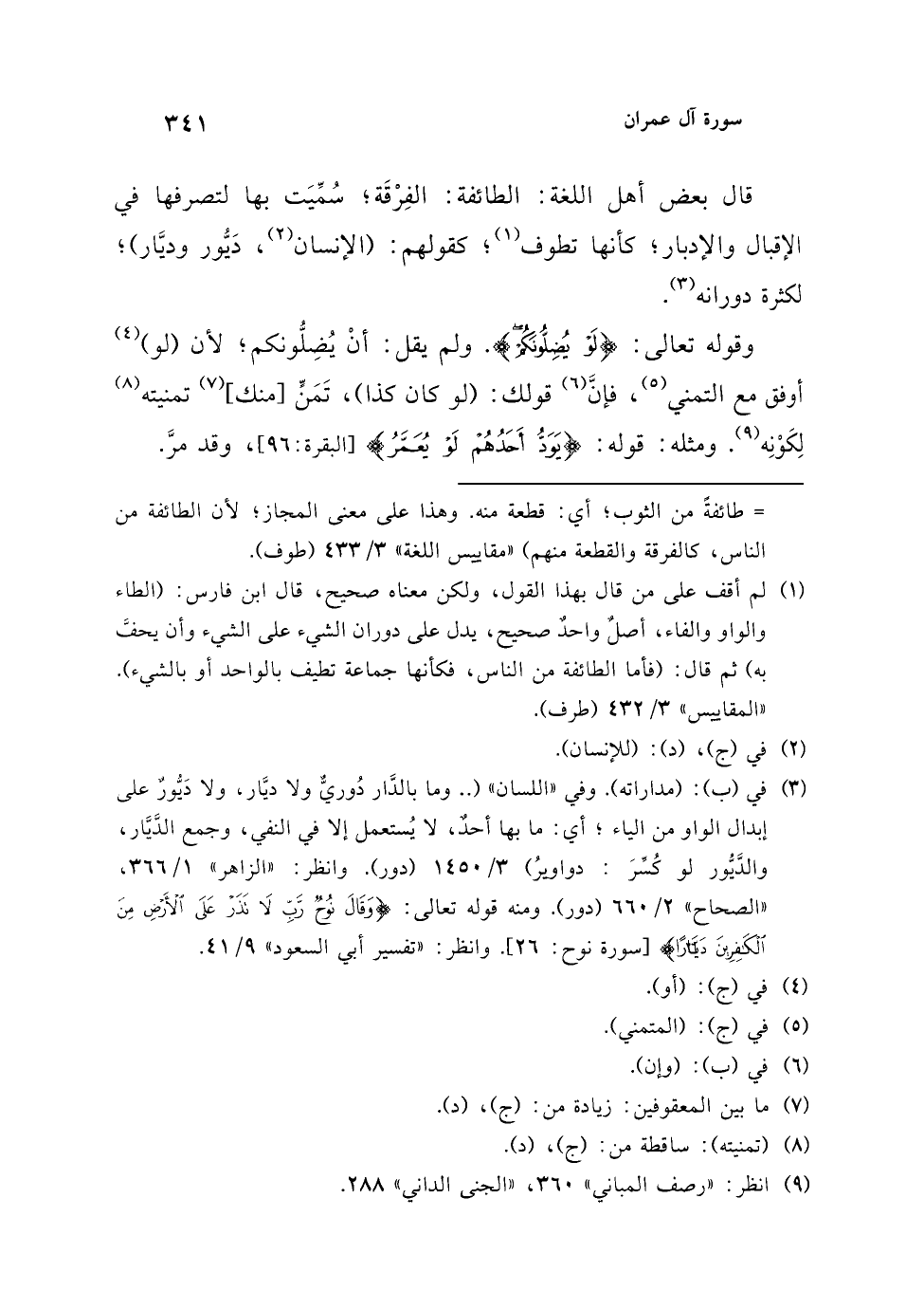 (¬1) لم أقف على من قال بهذا القول، ولكن معناه صحيح، قال ابن فارس: (الطاء والواو والفاء، أصلٌ واحدٌ صحيح، يدل على دوران الشيء على الشيء وأن يحفَّ به) ثم قال: (فأما الطائفة من الناس، فكأنها جماعة تطيف بالواحد أو بالشيء). "المقاييس" 3/ 432 (طرف).