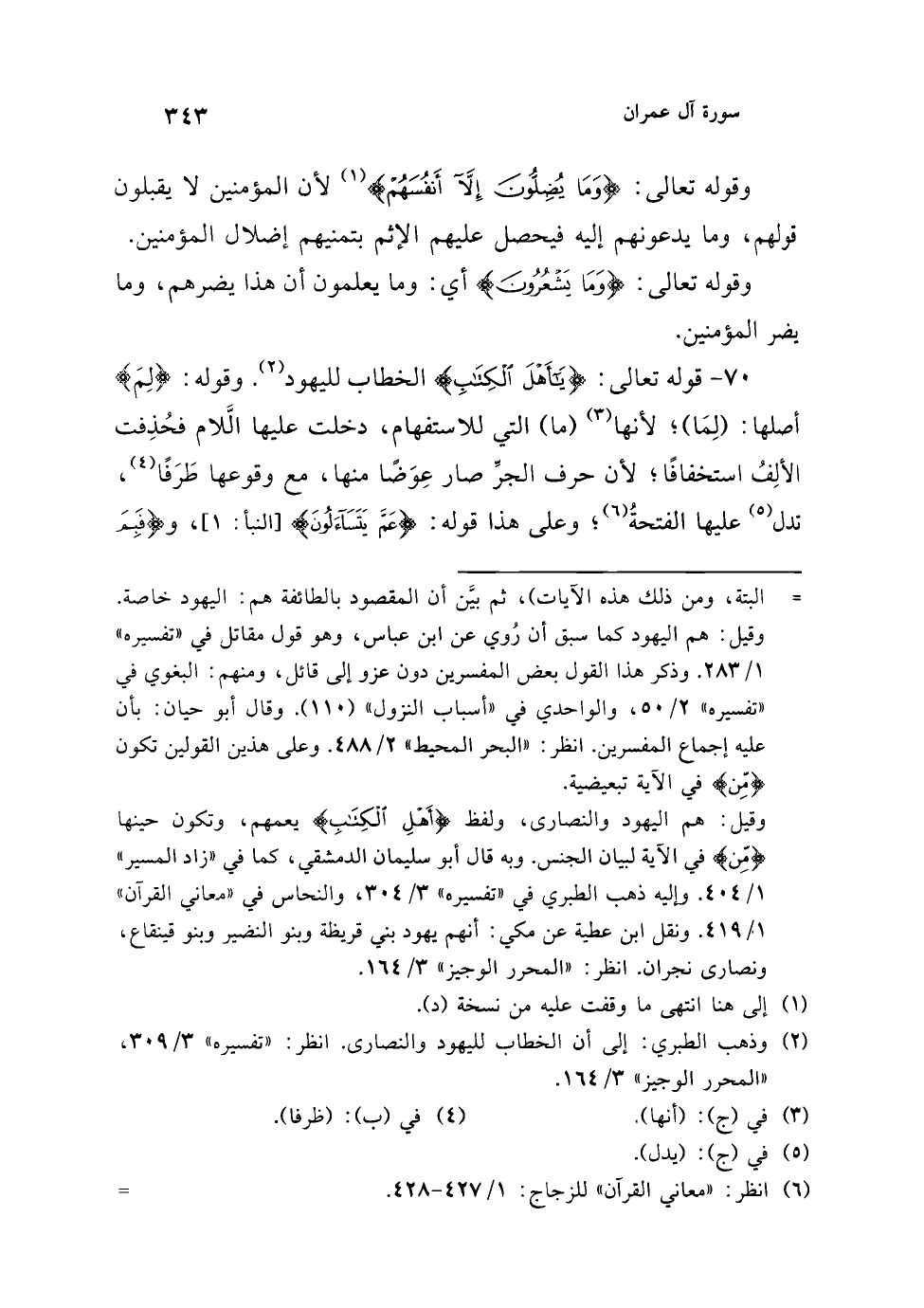 70 - قوله تعالى: {يَا أَهْلَ الْكِتَابِ} الخطاب لليهود (¬2). وقوله: {لِمَ} أصلها: (لِمَا)؛ لأنها (¬3) (ما) التي للاستفهام، دخلت عليها الَّلام فحُذِفت الألِفُ استخفافًا؛ لأن حرف الجرِّ صار عِوَضًا منها، مع وقوعها طَرَفًا (¬4)، تدل (¬5) عليها الفتحةُ (¬6)، وعلى هذا قوله: {عَمَّ يَتَسَاءَلُونَ} [النبأ:1]، و {فَبِمَ