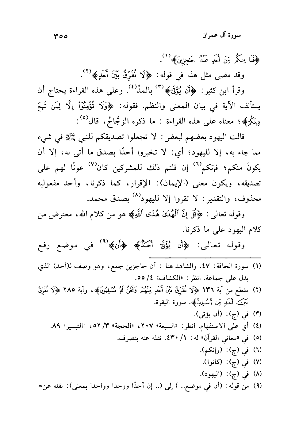 وقرأ ابن كثير: {أَنْ يُؤْتَى} (¬3) بالمدِّ (¬4). وعلى هذه القراءة يحتاج أن يستأنف الآية في بيان المعنى والنظم. فقوله: {وَلَا تُؤْمِنُوا إِلَّا لِمَنْ تَبِعَ دِينَكُمْ}؛ معناه على هذه القراءة: ما ذكره الزجَّاجُ، قال (¬5):
