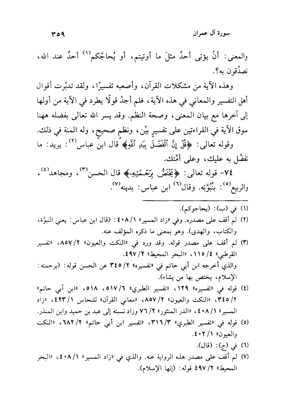 والمعنى: أنْ يؤتى أحدٌ مثلَ ما أوتيتم، أو يُحاجَّكم (¬1) أحدٌ عند الله، تصدِّقون به؟. وهذه الآية من مشكلات القرآن، وأصعبه تفسيرًا، ولقد تدبَّرت أقوال أهل التفسير والمعاني في هذه الآية، فلم أجدْ قولًا يطرد في الآية من أولها إلى آخرها مع بيان المعنى، وصحة النظم. وقد يسر الله تعالى بفضله ههنا سوق الآية في القراءتين على تفسيرٍ بيِّن، ونظمٍ صحيحٍ، وله المِّنة في ذلك.