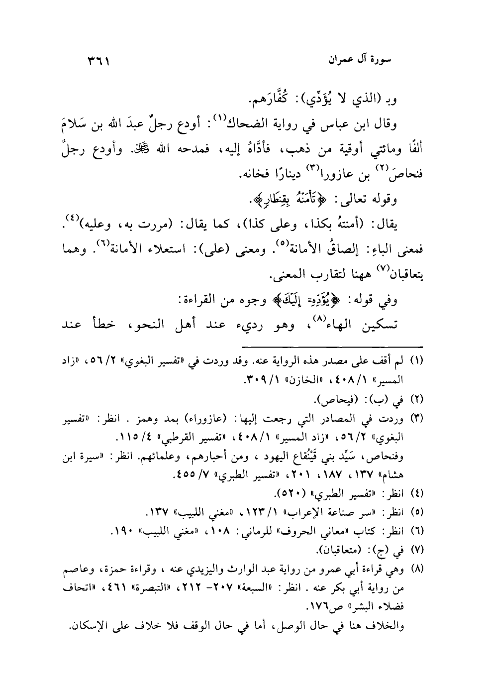 وقال ابن عباس في رواية الضحاك (¬1): أودع رجلٌ عبدَ الله بن سَلامَ ألفًا ومائتي أوقية من ذهب، فأدَّاهُ إليه، فمدحه الله عز وجل. وأودع رجلٌ فنحاصَ (¬2) بن عازورا (¬3) دينارًا فخانه.