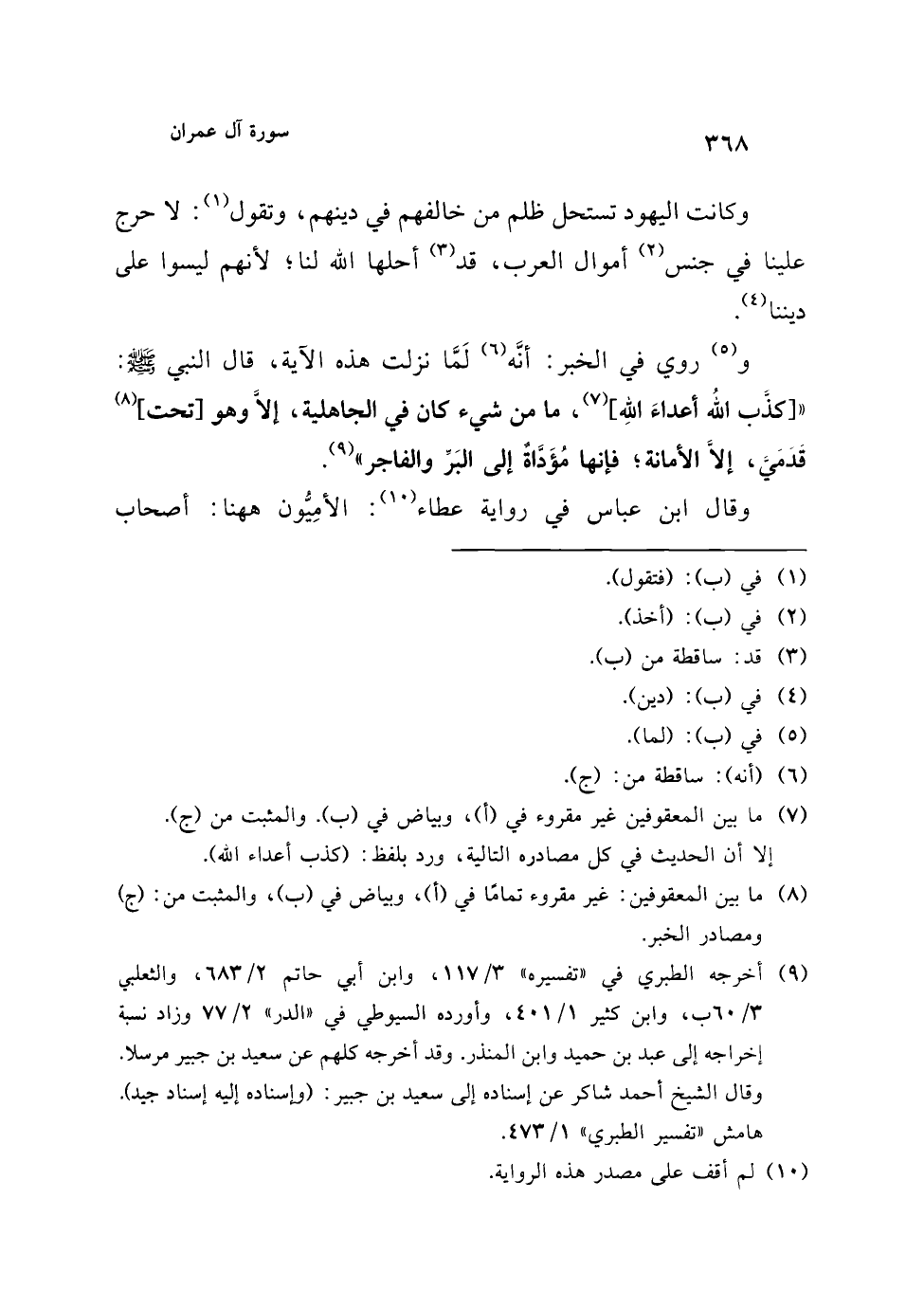 وكانت اليهود تستحل ظلم من خالفهم في دينهم، وتقول (¬1): لا حرج علينا في جنس (¬2) أموال العرب، قد (¬3) أحلها الله لنا؛ لأنهم ليسوا على ديننا (¬4).