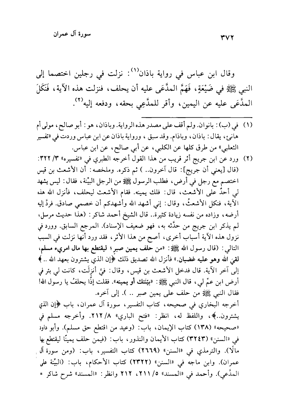 (¬2) ورد عن ابن جربج أثر قريب من هذا القول أخرجه الطبري في "تفسيره" 3/ 322: (قال [يعني أن جريج]: قال آخرون ..) ثم ذكره. وملخصه: أن الأشعث بن قيس اختصم مع رجل في أرض، فطلب الرسول - صلى الله عليه وسلم - من الرجل البيِّنة، فقال: ليس يشهد لي أحدٌ على الأشعث، قال: فلك يمينه فقام الأشعث ليحلف، فأنزل الله هذه الآية، فنكل الأشعثُ، وقال: إني أشهد الله وأشهدكم أن خصمي صادق. فردَّ إليه أرضه، وزاده من نفسه زيادة كثيرة .. قال الشيخ أحمد شاكر: (هذا حديث مرسل، لم يذكر ابن جريج من حدَّثه به، فهو ضعيف الإسناد). المرجع السابق. وورد في نزول هذه الآية أسباب أخرى، أصح من هذا الأثر، فقد ورد أنها نزلت في السبب التالي: (قال رسول الله - صلى الله عليه وسلم -: "من حلف يمين صبر؛ ليقتطع بها مال امريء مسلم، لقيَ الله وهو عليه غضبان". فأنزل الله تصديق ذلك {إِنَّ الَّذِينَ يَشْتَرُونَ بِعَهْدِ اللَّهِ ...} إلى آخر الآية. قال فدخل الأشعث بن قيس، وقال: فيَّ أنزِلَت، كانت لي بئر في أرض ابن عمِّ لي، قال النبي - صلى الله عليه وسلم -: "بيِّنَتك أو يمينه". فقلت إذًا يحلفُ يا رسول الله! فقال النبي - صلى الله عليه وسلم - من حلف على يمين صبر ..). إلى آخره.