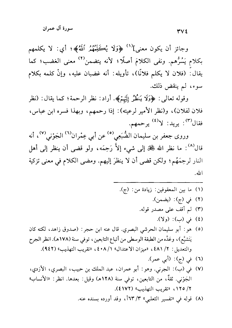 وروى جعفر بن سليمان الضُّبَعِي (¬5) عن أبي عِمْران (¬6) الجَوْني (¬7)، أنه قال (¬8): ما نظر الله عز وجل إلى شيء إلاَّ رَحِمَه، ولو قضى أن ينظر إلى أهل النار لرحِمَهُم؛ ولكن قضى أن لا ينظرَ إليهم. ومضى الكلام في معنى تزكية الله.