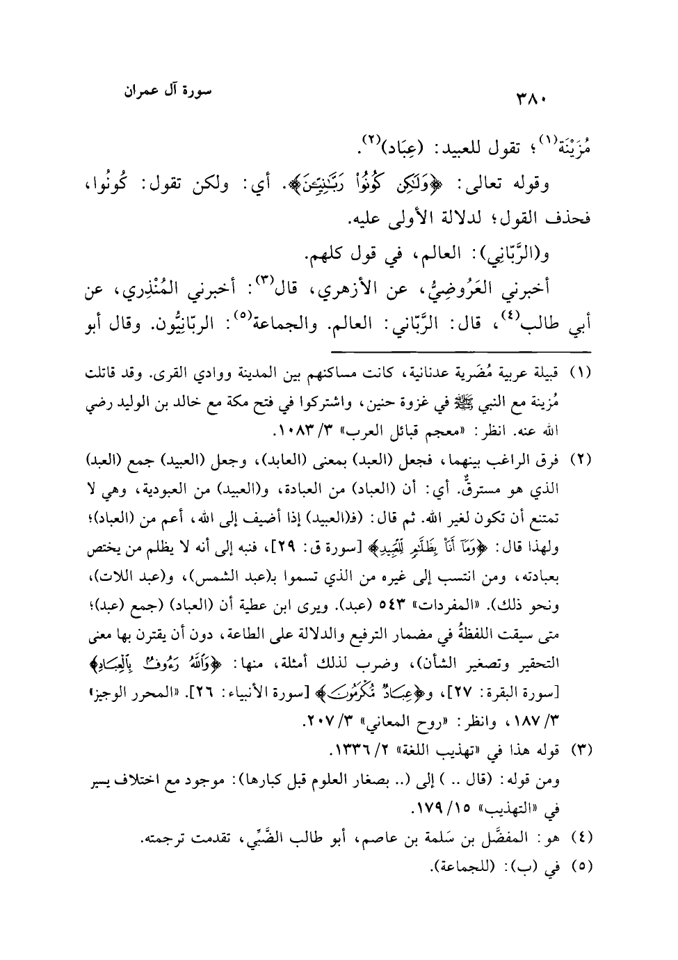 أخبرني العَرُوضِيُّ، عن الأزهري، قال (¬3): أخبرني المُنْذِري، عن أبي طالب (¬4)، قال: الرَّبّاني: العالم. والجماعة (¬5): الربّانِيُّون. وقال أبو