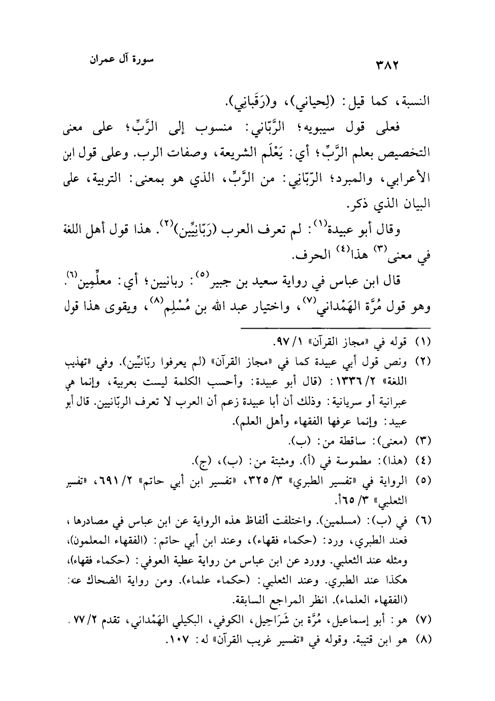 (¬2) ونص قول أبي عبيدة كما في "مجاز القرآن" (لم يعرفوا ربّانيِّين). وفي "تهذيب اللغة" 2/ 1336: (قال أبو عبيدة: وأحسب الكلمة ليست بعربية، وإنما هي عبرانية أو سريانية: وذلك أن أبا عبيدة زعم أن العرب لا تعرف الربّانيين. قال أبو عبيد: وإنما عرفها الفقهاء وأهل العلم).