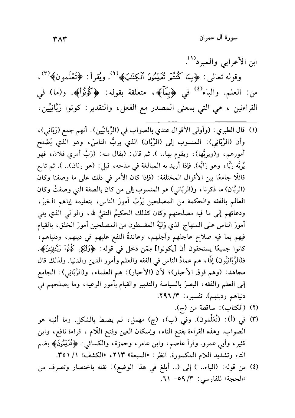 وقوله تعالى: {بِمَا كُنْتُمْ تُعَلِّمُونَ الْكِتَابَ} (¬2). ويُقرأ: {تُعَلِّمُونَ} (¬3)، من: العلم. والباء (¬4) في {بِمَا}، متعلقة بقوله: {كُونُوا}. و (ما) في القراءتين، هي التي بمعنى المصدر مع الفعل، والتقدير: كونوا رَبَّانِيِّين،