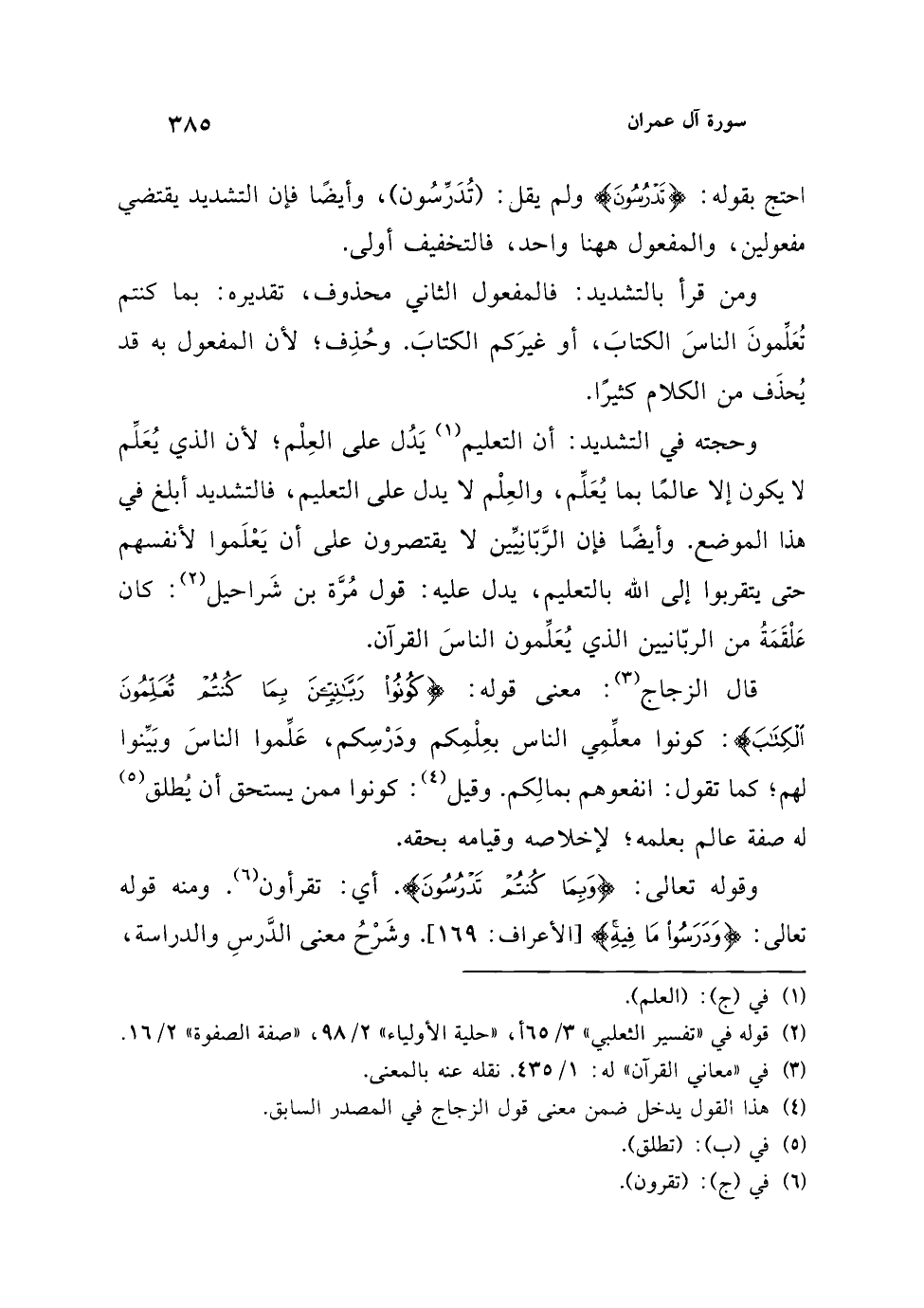 وحجته في التشديد: أن التعليم (¬1) يَدُل على العِلْم؛ لأن الذي يُعَلِّم لا يكون إلا عالمًا بما يُعَلِّم، والعِلْم لا يدل على التعليم، فالتشديد أبلغ في هذا الموضع. وأيضًا فإن الرَّبّانِيّين لا يقتصرون على أن يَعْلَموا لأنفسهم حتى يتقربوا إلى الله بالتعليم، يدل عليه: قول مُرَّة بن شَراحيل (¬2): كان عَلْقَمَةُ من الربّانيين الذي يُعَلِّمون الناسَ القرآن.
