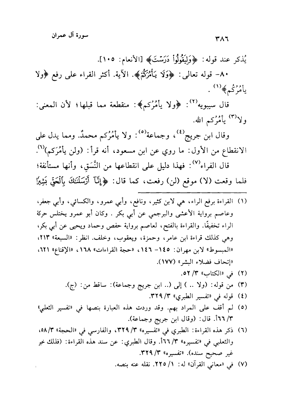 80 - قوله تعالى: {وَلَا يَأْمُرَكُمْ}. الآية. أكثر القراء على رفع {ولا يأمُرُكُم} (¬1).