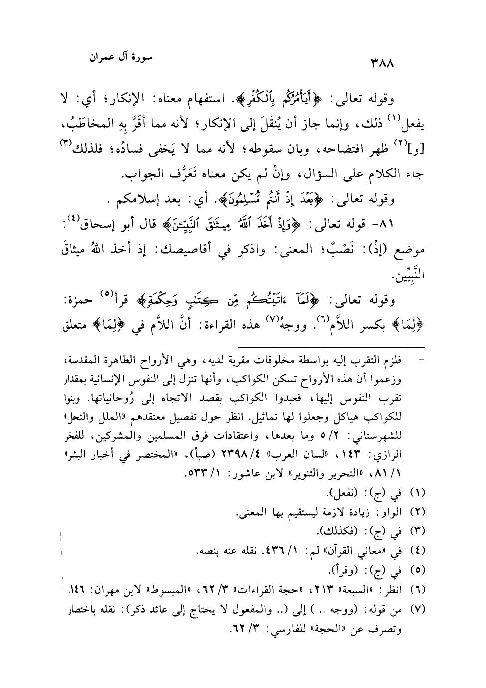 81 - قوله تعالى: {وَإِذْ أَخَذَ اللَّهُ مِيثَاقَ النَّبِيِّينَ} قال أبو إسحاق (¬4): موضع (إذْ): نَصبٌ؛ المعنى: واذكر في أقاصيصك: إذ أخذ اللهُ ميثاقَ النَّبِيِّين.