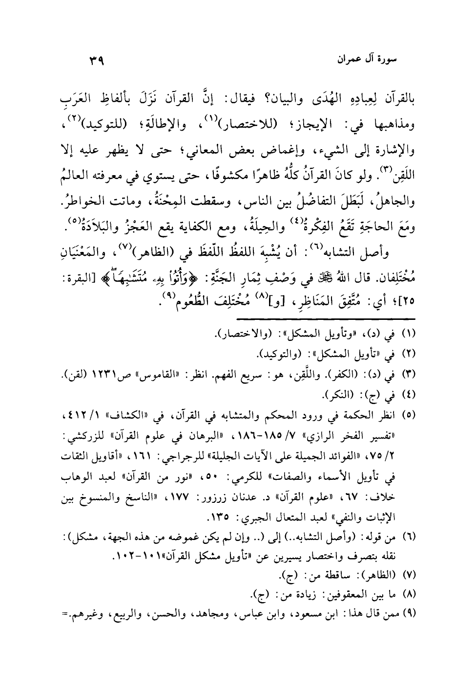 (¬5) انظر الحكمة في ورود المحكم والمتشابه في القرآن، في "الكشاف" 1/ 412، "تفسير الفخر الرازي" 7/ 185 - 186، "البرهان في علوم القرآن" للزركشي: 2/ 75، "الفوائد الجميلة على الآيات الجليلة" للرجراجي: 161، "أقاويل الثقات في تأويل الأسماء والصفات" للكرمي: 50، "نور من القرآن" لعبد الوهاب خلاف: 67، "علوم القرآن" د. عدنان زرزور: 177، "الناسخ والمنسوخ بين الإثبات والنفي" لعبد المتعال الجبري: 135.