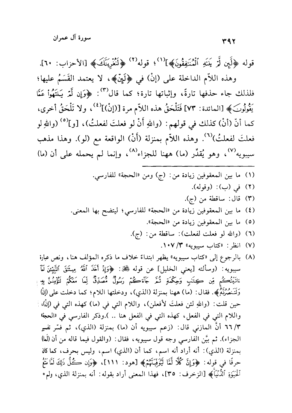 وهذه اللاّم الداخلة على (إنْ) في {لَئِنْ}، لا يعتمد القَسَمُ عليها؛ فلذلك جاء حذفها تارةً، وإثباتها تارة؛ كما قال (¬3): {وَإِنْ لَمْ يَنْتَهُوا عَمَّا يَقُولُونَ} [المائدة: 73]، فَتَلْحَقُ هذه اللاّم مرة [(إنْ)] (¬4)، ولا تَلْحَقُ أخرى، كما أنّ (أنْ) كذلك في قولهم: (واللهِ أَنْ لو فعلتَ لفعلتُ)، [و] (¬5) (واللهِ لو فعلتَ لفعلتُ) (¬6). وهذه اللاّم بمنزلة (أَنْ) الواقعة مع (لو). وهذا مذهب سيبويه (¬7)، وهو يُقدِّر (ما) ههنا للجزاء (¬8)، وانما لم يحمله على أن (ما)
