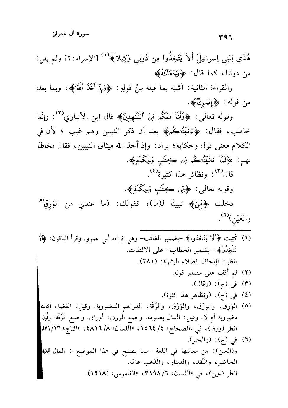 (¬1) كُتِبت {ألّا يَتّخذوا} -بضمير الغائب- وهي قراءة أبي عمرو. وقرأ الباقون: {الَّا تَتَّخِذُوا} -بضمير الخطاب- على الالتفات. انظر: "إتحاف فضلاء البشر": (281).