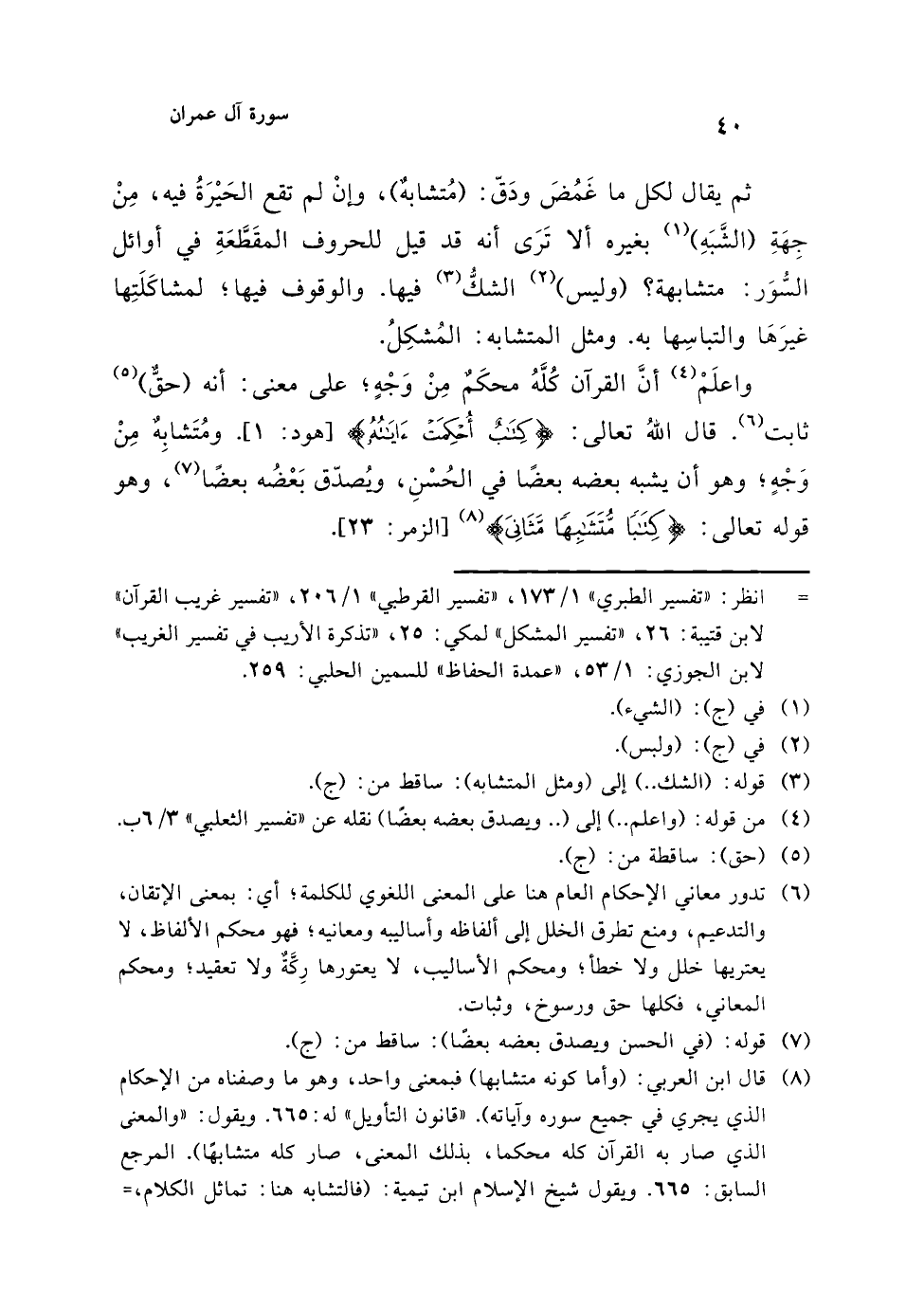 (¬8) قال ابن العربي: (وأما كونه متشابها) فبمعنى واحد، وهو ما وصفناه من الأحكام الذي يجري في جميع سوره وآياته). "قانون التأويل" له: 665. ويقول: "والمعنى الذي صار به القرآن كله محكما، بذلك المعنى، صار كله متشابهًا). المرجع السابق: 665. ويقول شيخ الإسلام ابن تيمية: (فالتشابه هنا: تماثل الكلام, وتناسبه؛ بحيث يصدق بعضه بعضًا. فالإحكام العام في معنى التشابه العام، بخلاف الإحكام الخاص والتشابه الخاص؛ فإنهما متنافيان). ذكره ابن الوزير في "إيثار الحق على الخلق" 92. وانظر في هذا المعنى: "الرسالة التدميرية" لابن تيمية: 65، "القائد إلى تصحيح العقائد"، لعبد الرحمن المعلمي: 161، "ترجيح أساليب القرآن على أساليب اليونان" لابن الوزير: 124، "أقاويل الثقات"، للكرمي: 48.