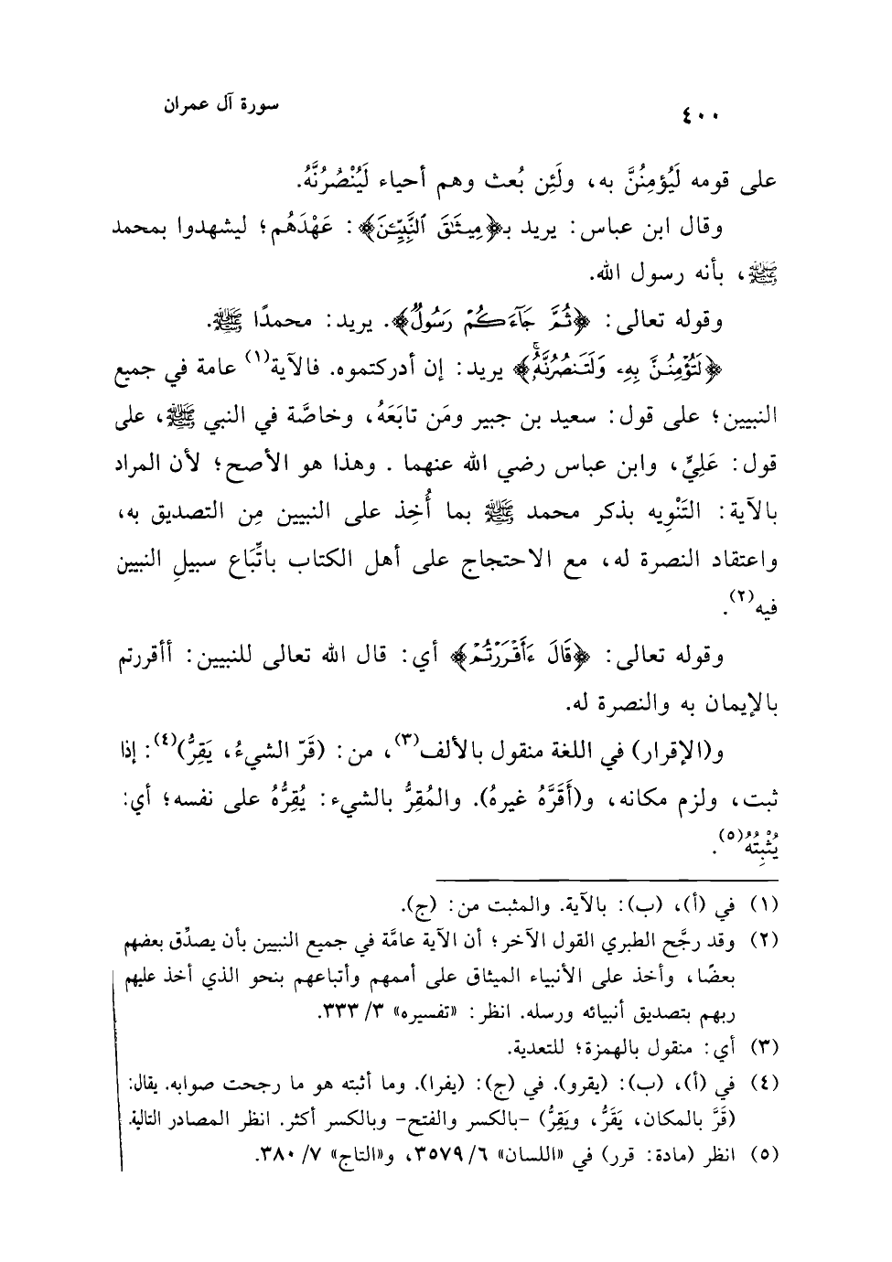 (¬2) وقد رجح الطبري القول الآخر؛ أن الآية عامَّة في جميع النبيين بأن يصدِّق بعضهم بعضًا، وأخذ على الأنبياء الميثاق على أممهم وأتباعهم بنحو الذي أخذ عليهم ربهم بتصديق أنبيائه ورسله. انظر: "تفسيره" 3/ 333.