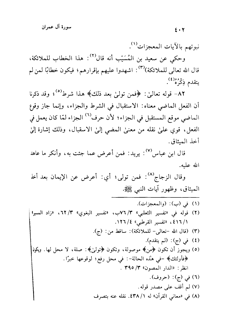 82 - قوله تعالى: {فَمَنْ تَوَلَّى بَعْدَ ذَلِكَ} هذا شرط (¬5)؛ وقد ذكرنا أن الفعل الماضي معناه: الاستقبال في الشرط والجزاء، وإنما جاز وقوع الماضي موقع المستقبل في الجزاء؛ لأن حرف (¬6) الجزاء لمّا كان يعمل في الفعل، قوي على نقله من معنى المضي إلى الاسقبال، وذلك إشارة إلى أخذ الميثاق.