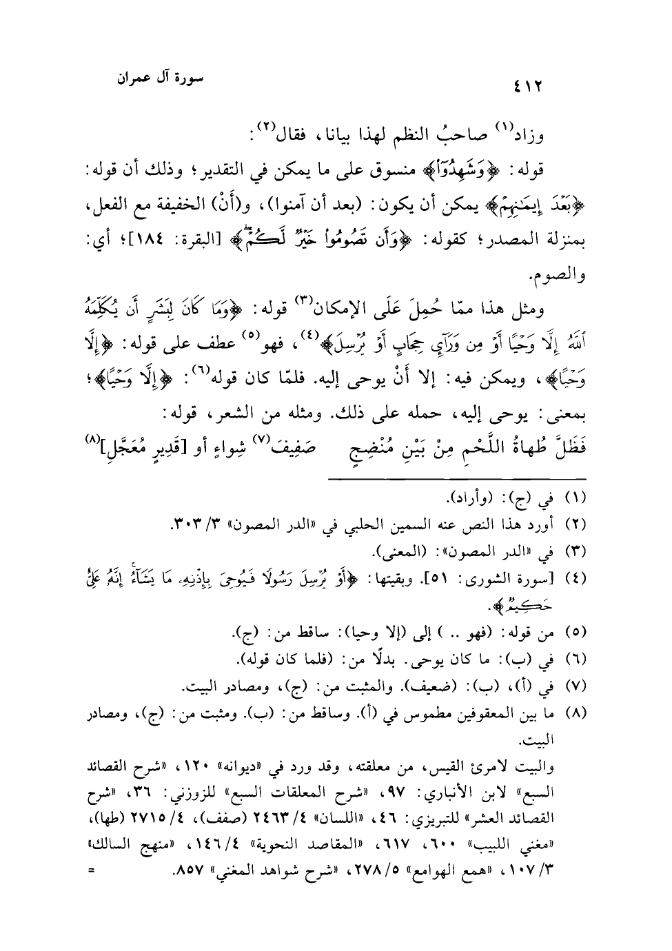 ومثل هذا ممّا حُمِلَ عَلَى الإمكان (¬3) قوله: {وَمَا كَانَ لِبَشَرٍ أَنْ يُكَلِّمَهُ اللَّهُ إِلَّا وَحْيًا أَوْ مِنْ وَرَاءِ حِجَابٍ أَوْ يُرْسِلَ} (¬4)، فهو (¬5) عطف على قوله: {إِلَّا وَحْيًا}، ويمكن فيه: إلا أَنْ يوحى إليه. فلمّا كان قوله (¬6): {إِلَّا وَحْيًا} بمعنى: يوحى إليه، حمله على ذلك. ومثله من الشعر، قوله: