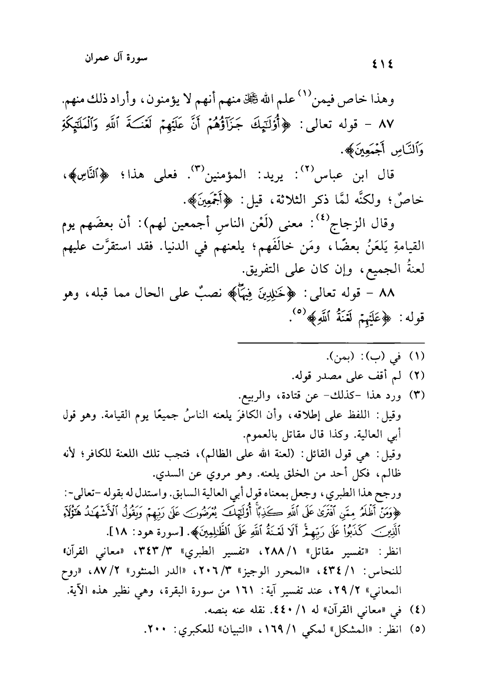 انظر: "تفسير مقاتل" 1/ 288، "تفسير الطبري" 3/ 343، "معاني القرآن" للنحاس: 1/ 434، "المحرر الوجيز" 3/ 206، "الدر المنثور" 2/ 87، "روح المعاني" 2/ 29، عند تفسير آية: 161 من سورة البقرة، وهي نظير هذه الآية.