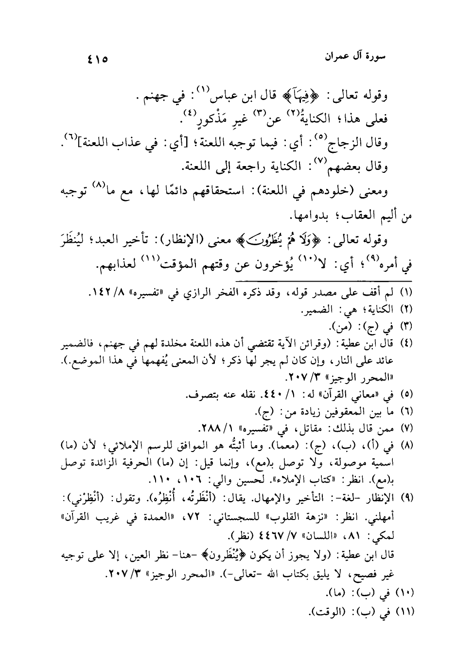 (¬4) قال ابن عطية: (وقرائن الآية تقتضي أن هذه اللعنة مخلدة لهم في جهنم، فالضمير عائد على النار، وإن كان لم يجر لها ذكر؛ لأن المعنى يفهمها في هذا الموضع.). "المحرر الوجيز" 3/ 207.