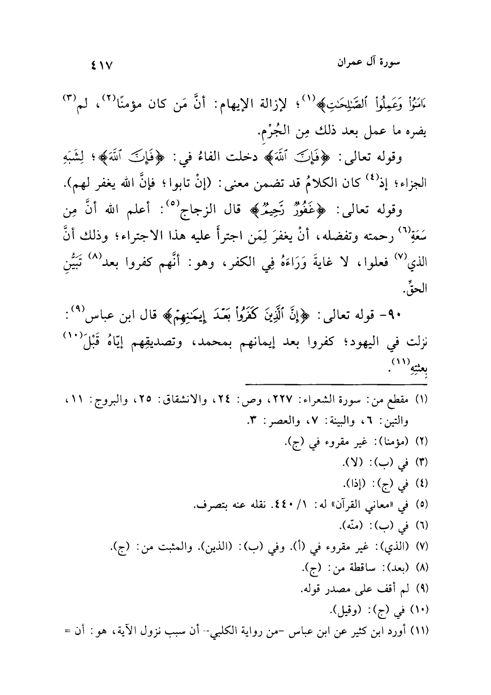 (¬1) مقطع من: سورة الشعراء: 227، وص: 24، والانشقاق: 25، والبروج: 11، والتين: 6، والبينة: 7، والعصر: 3.