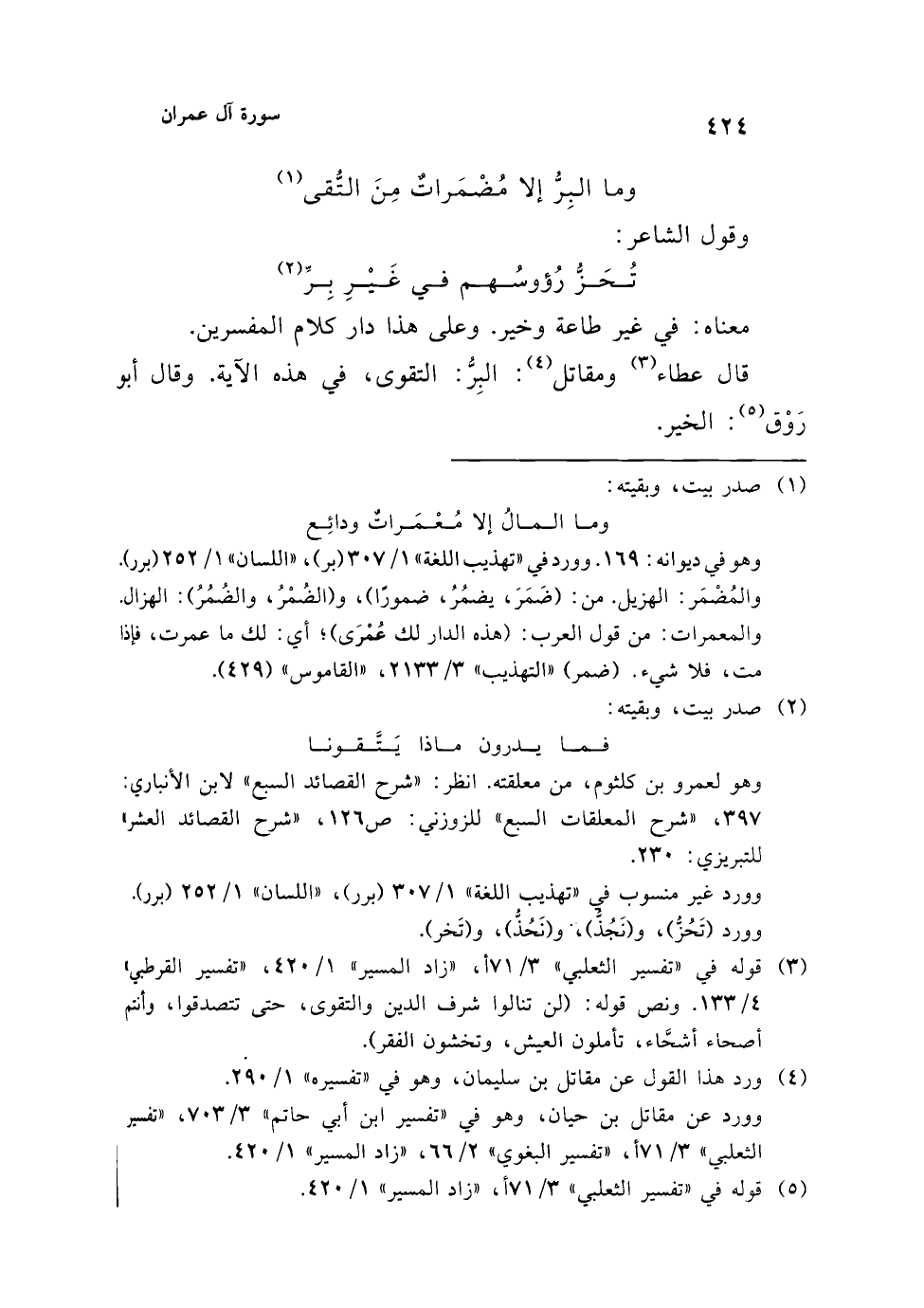 (¬3) قوله في "تفسير الثعلبي" 3/ 71 أ، "زاد المسير" 1/ 420، "تفسير القرطبي" 4/ 133. ونص قوله: (لن تنالوا شرف الدين والتقوى، حتى تتصدقوا، وأنتم أصحاء أشحَّاء، تأملون العيش، وتخشون الفقر).