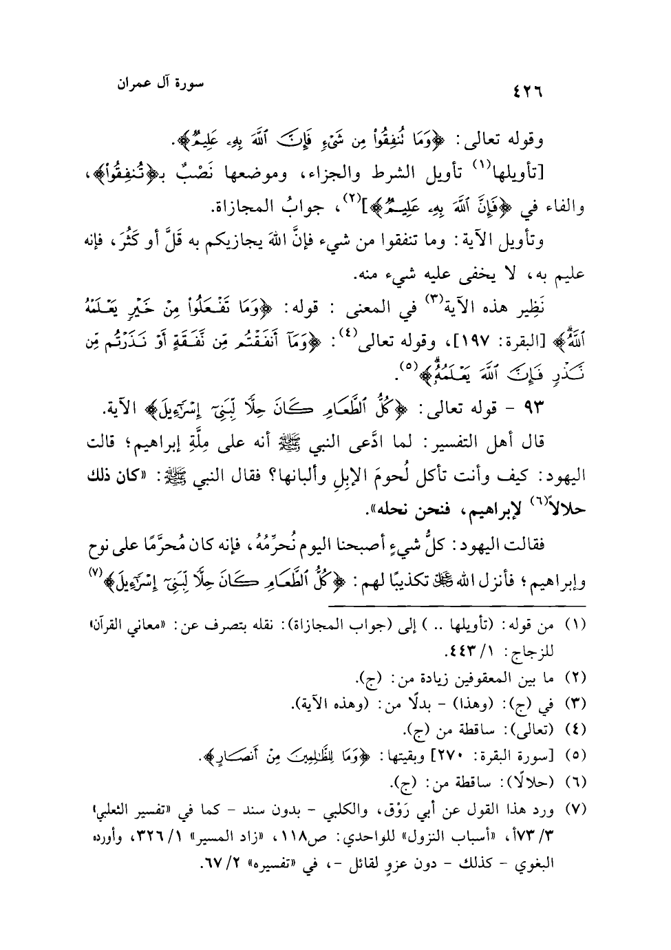 فقالت اليهود: كلُّ شيءٍ أصبحنا اليوم نُحرِّمُهُ، فإنه كان مُحرَّمًا على نوح وإبراهيم؛ فأنزل الله عز وجل تكذيبًا لهم: {كُلُّ الطَّعَامِ كَانَ حِلًّا لِبَنِي إِسْرَائِيلَ} (¬7)