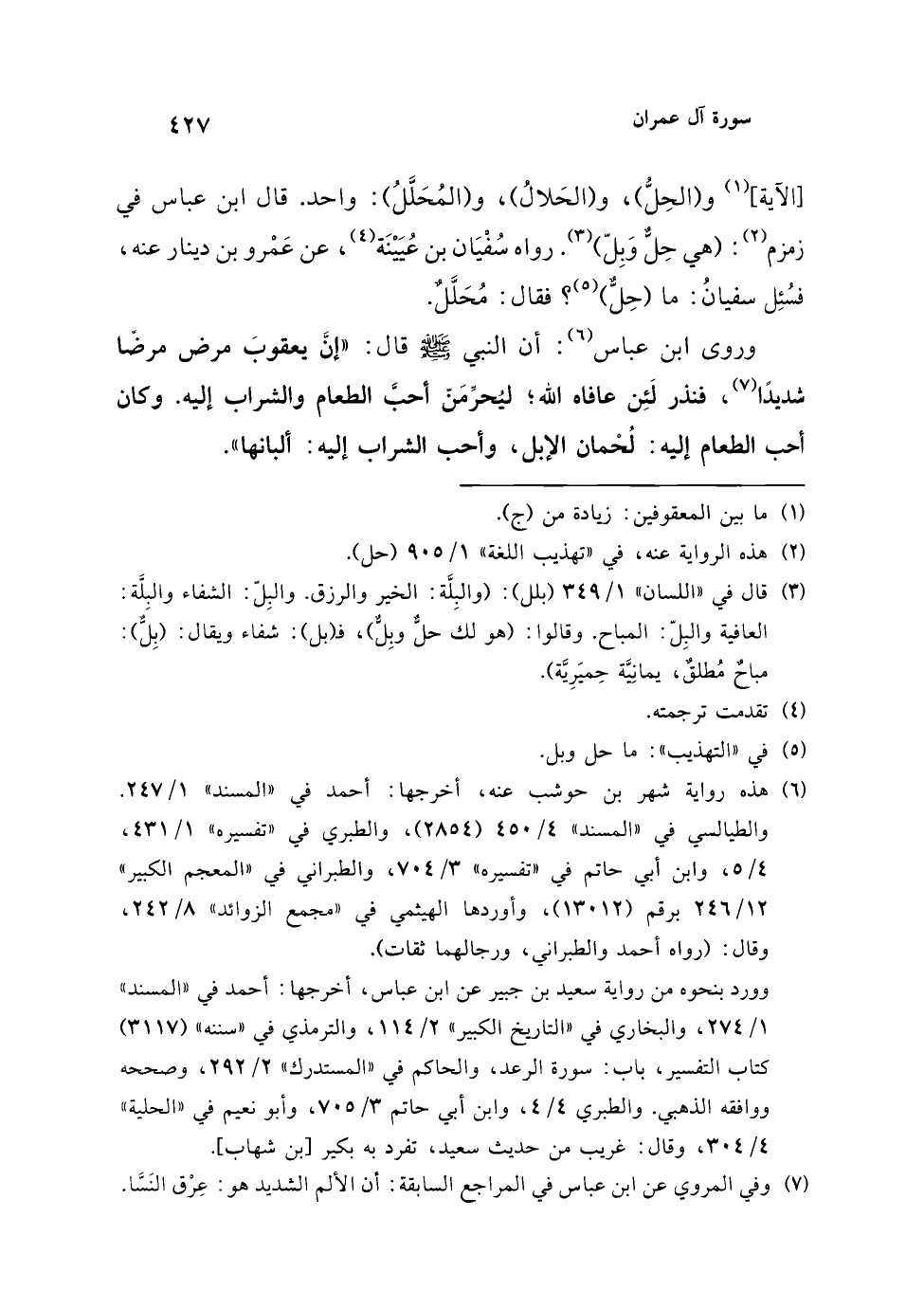 وروى ابن عباس (¬6): أن النبي - صلى الله عليه وسلم - قال: "إنَّ يعقوبَ مرض مرضًا شديدًا (¬7)، فنذر لَئِن عافاه الله؛ ليُحرِّمَنّ أحبَّ الطعام والشراب إليه. وكان أحب الطعام إليه: لُحْمان الإبل، وأحب الشراب إليه: ألبانها".